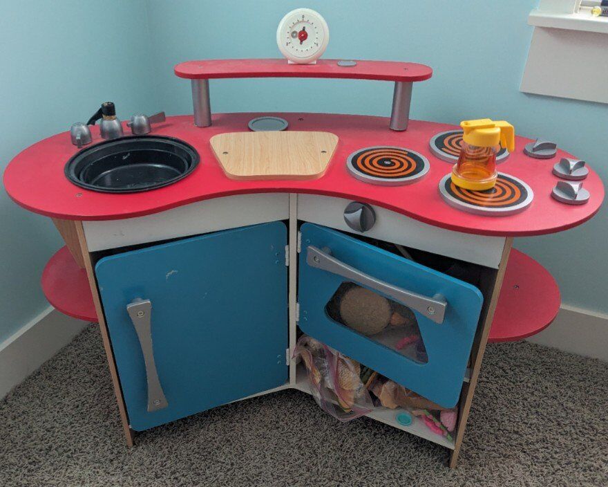 ZelleMelissa & Doug Cook's Corner Wooden Kitchen PLUS DOZENS of additional kids play food and serving items! Good condition overall with a couple creative additions in place of a couple missing pieces that won't affect overall play.