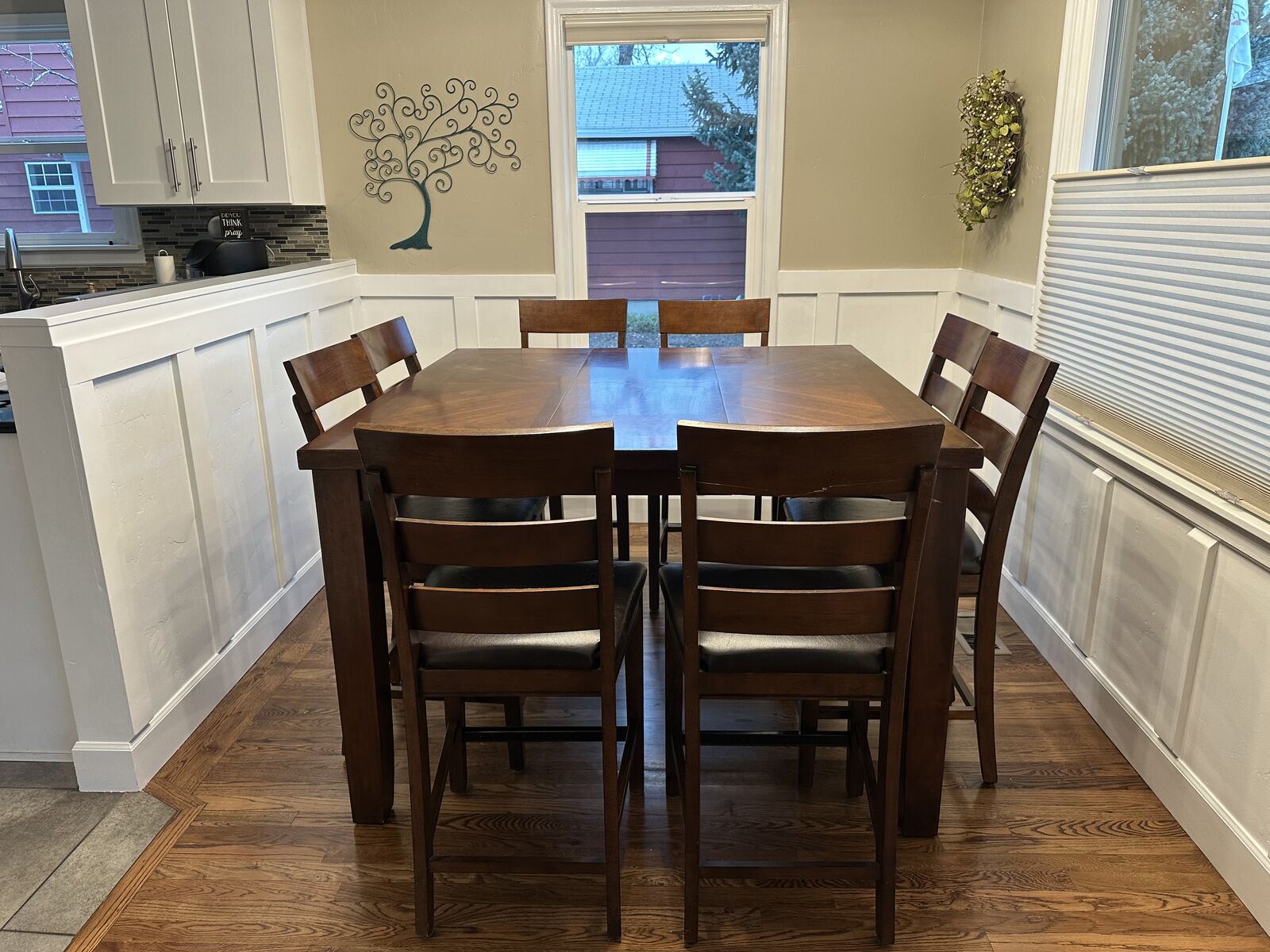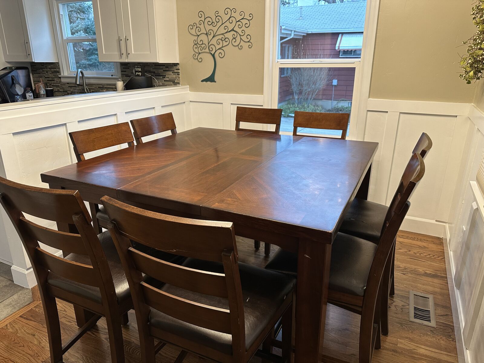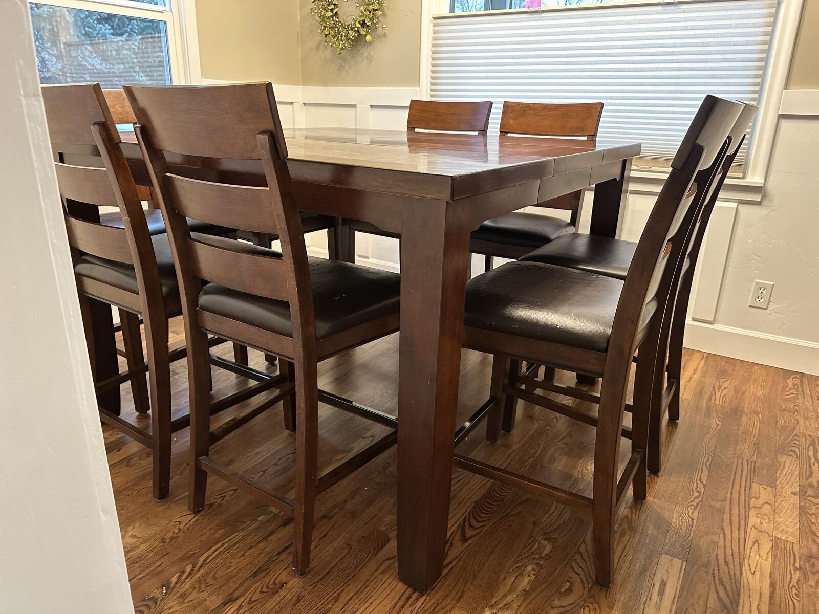 VenmoCounter height kitchen table with a leaf and 8 chairs. It's about 10 years old so the table top isn't perfect and some of the seats are getting worn. But it's still a great working table.