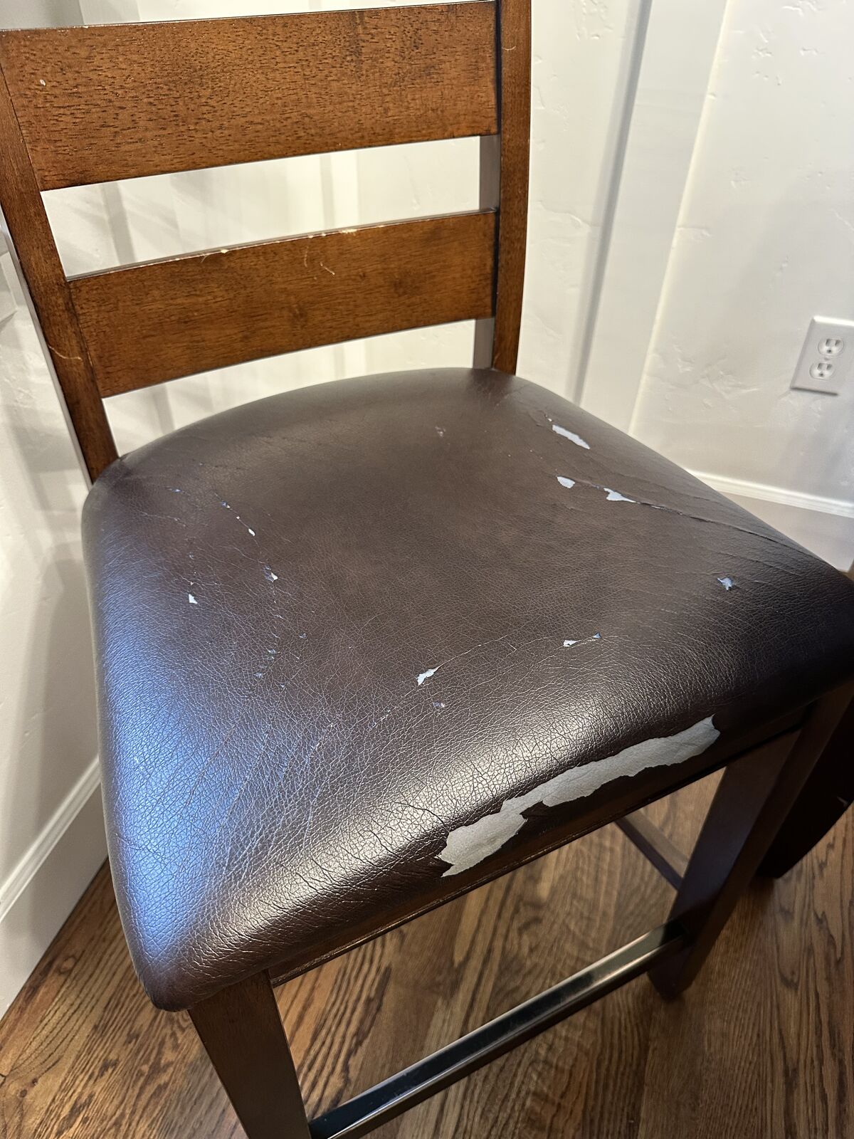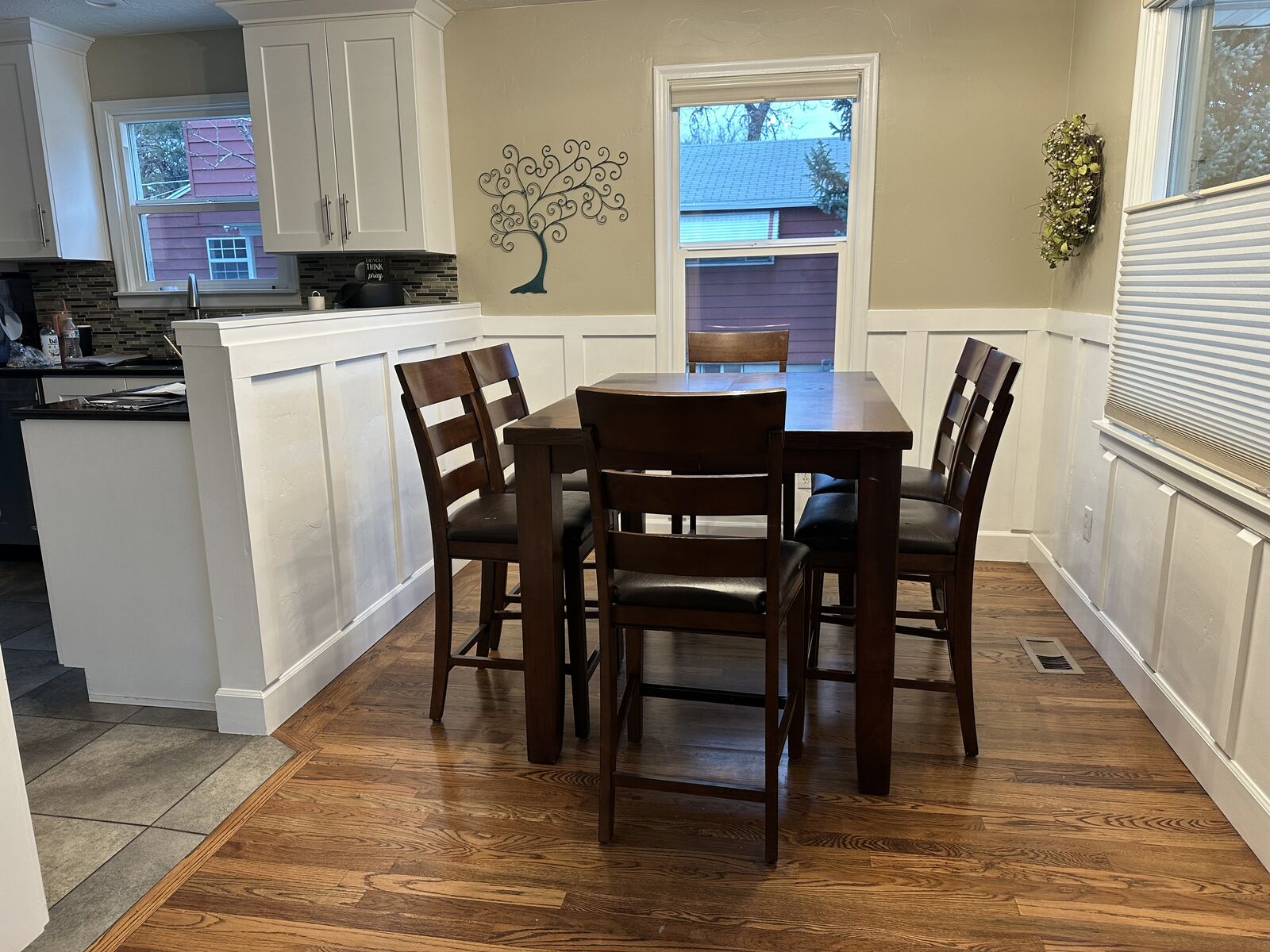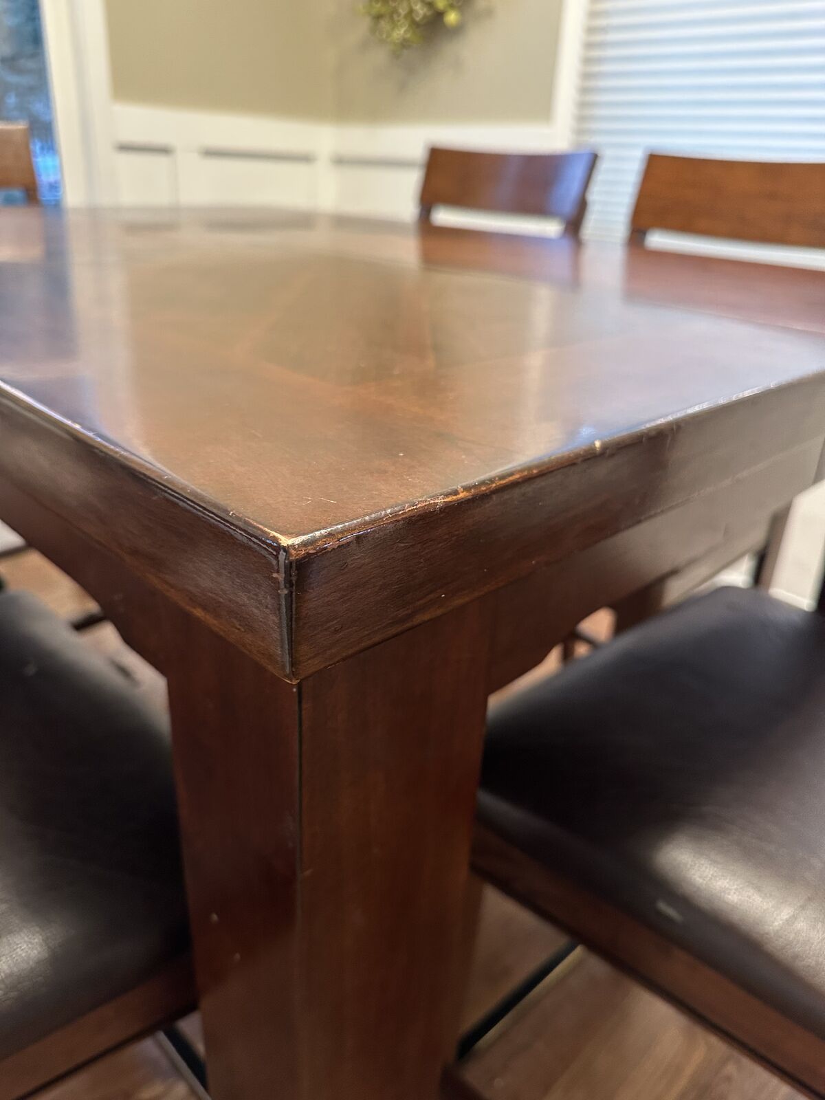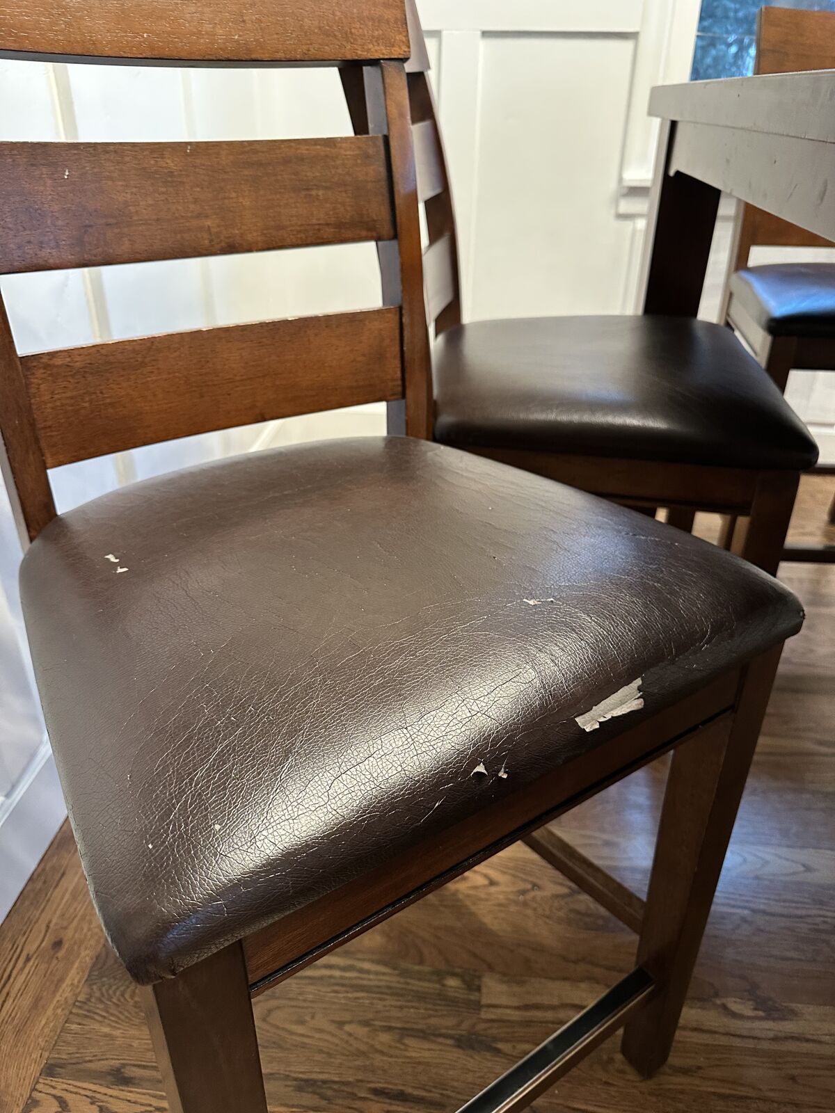 VenmoCounter height kitchen table with a leaf and 8 chairs. It's about 10 years old so the table top isn't perfect and some of the seats are getting worn. But it's still a great working table.