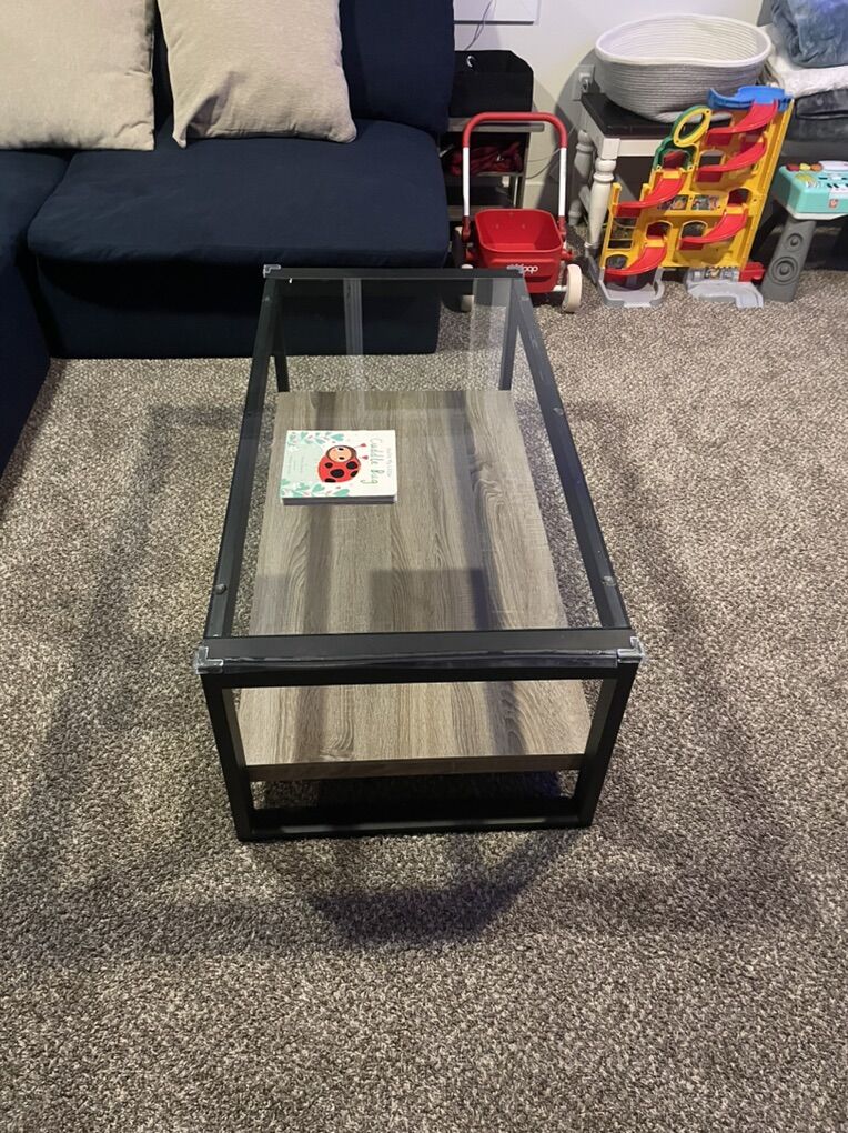 VenmoGlass coffee table. 5 years old, in good condition. No longer needed due to glass not being suitable for a toddler. Safe edges currently shown in photo are removeable.