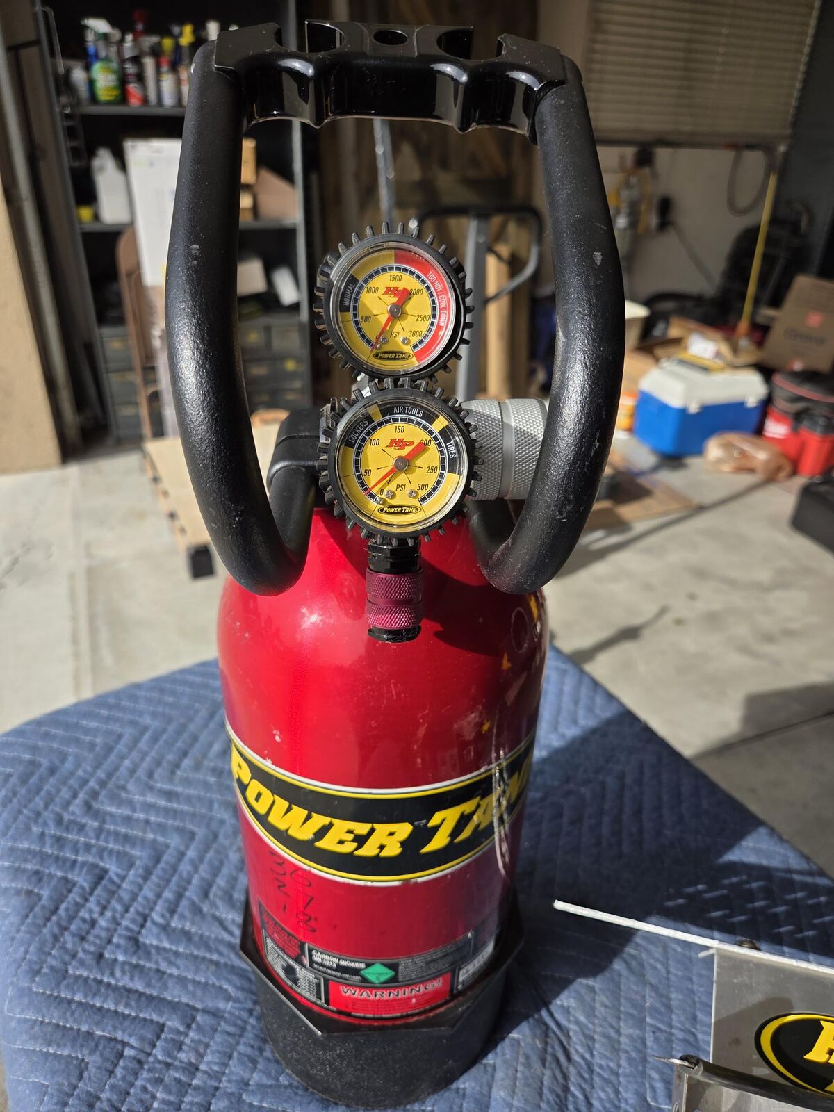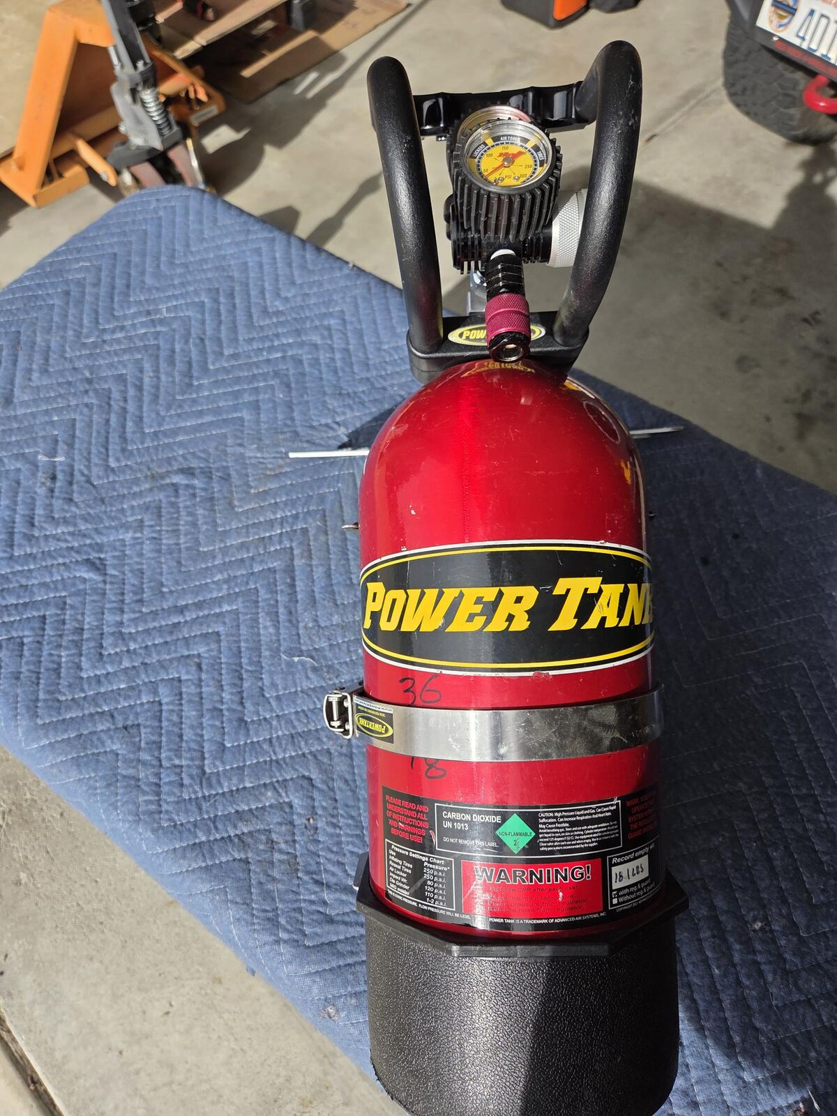 Venmo15lb "PowerTank" CO2 tank with regulator guages and mounting bracket for the back of a Jeep Rangler Unlimited (JLU). Great condition.