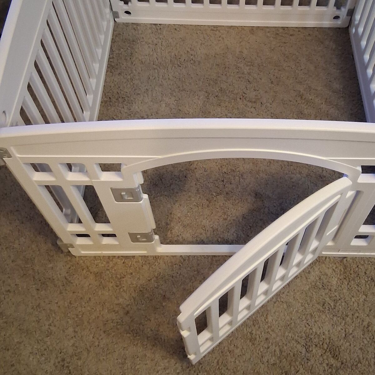 3 foot square playpen. White vinyl with door. Easy too snap together and take down.