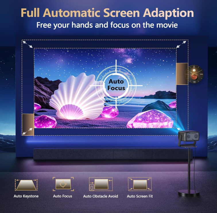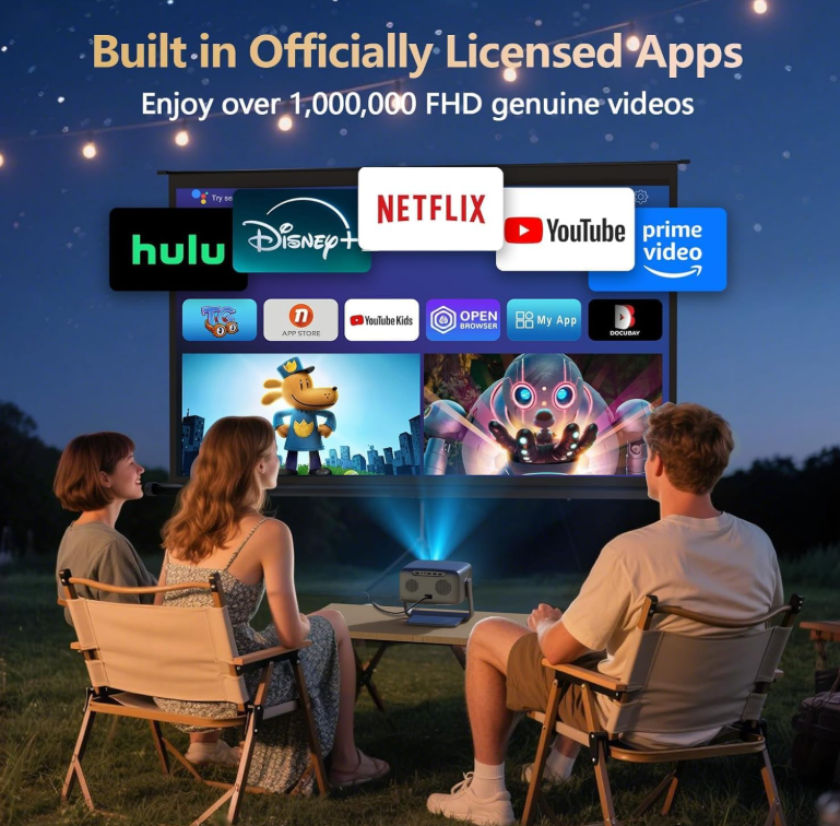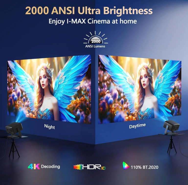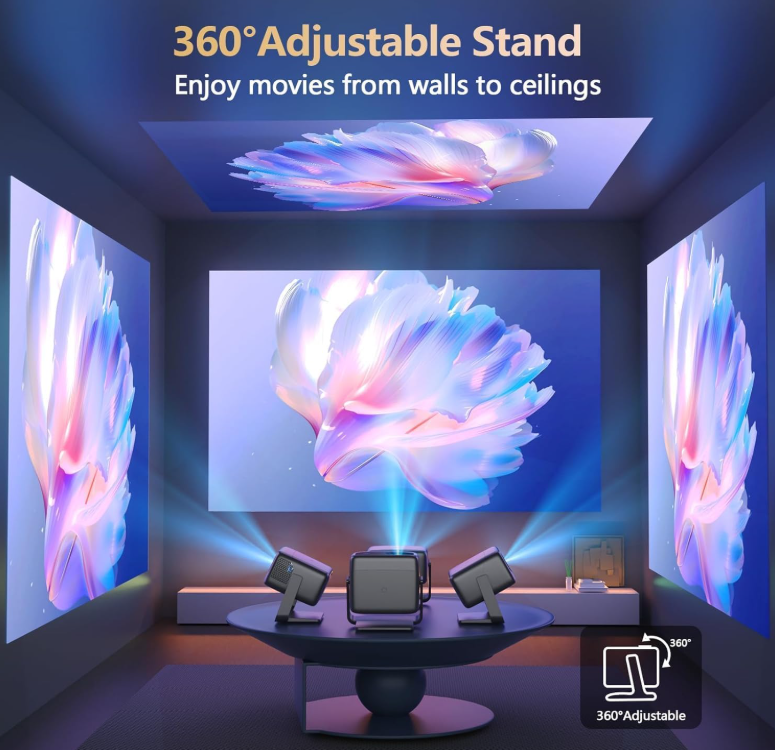 Zelle2000 ANSI Lumens Ultra-Bright & 360°Rotatable Stand– With upgrade 2000 ANSI lumens of brightness, enjoy vivid, true 4k cinematic viewing anytime, even in daylight. Perfect for rooms with some light or outdoor movie nights without compromising image clarity. Plus, our exclusive 360° rotatable stand lets you pivot from wall to ceiling projection in seconds. Perfect for versatile setups, whether you're gaming, bedtime stargazing, or presenting Official Apps and Unparalleled 36W 360° SRS HiFi Sound---The 4k projector with wifi and bluetooth is pre-installed licensed apps, which allows us to stream contents directly from apps like NetfIix, YouTube, prime video, Disny+, HuIu without extra devices. Moreover, experience cinema-grade audio with our 36W DoIby-supported stereo speakers (with one-touch surround sound activation). Featuring deep bass and crystal-clear highs, it delivers room-filling sound—perfect for movie nights, parties, or outdoor gatherings
