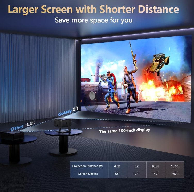 1:1 Throw Ratio and 50000:1 Contrast Ratio and Giant Display Size---The GO2 projector 4k projects a 100" image from just 8 feet—30% closer than standard home projectors (others require 10.8 ft). With same projection distance, the image size is 30% larger than others. Contrast is the difference between the darkest part of the image and the brightest. 50,000:1 ratio delivers deeper blacks and brighter whites—no washed-out images, just lifelike clarity. Adjust from 50" to 500" (4-25 ft distance)—the largest scalable display in its class. (Recommended: 100" for optimal viewing)