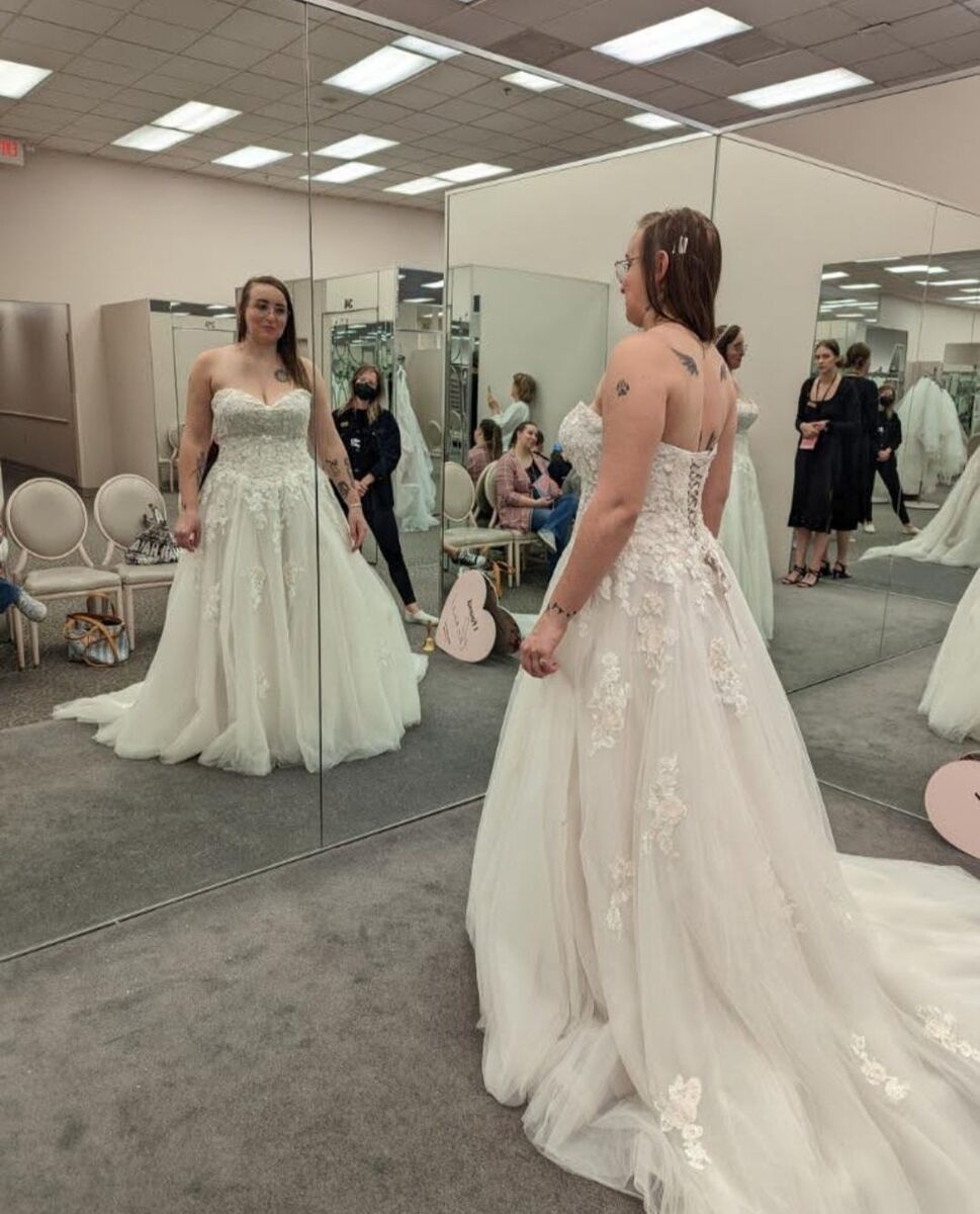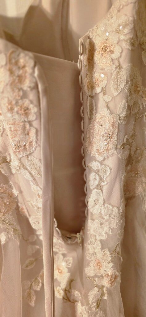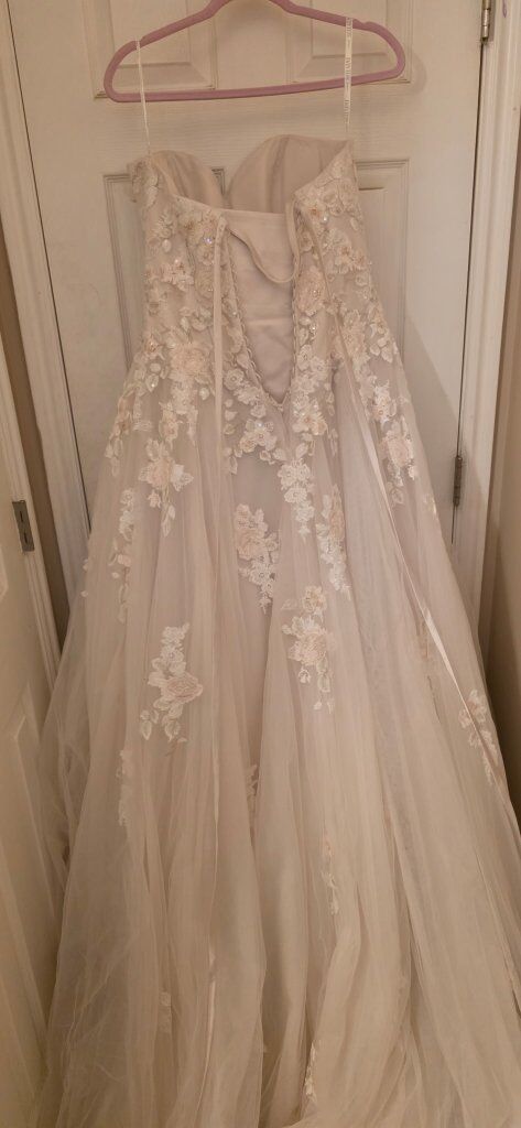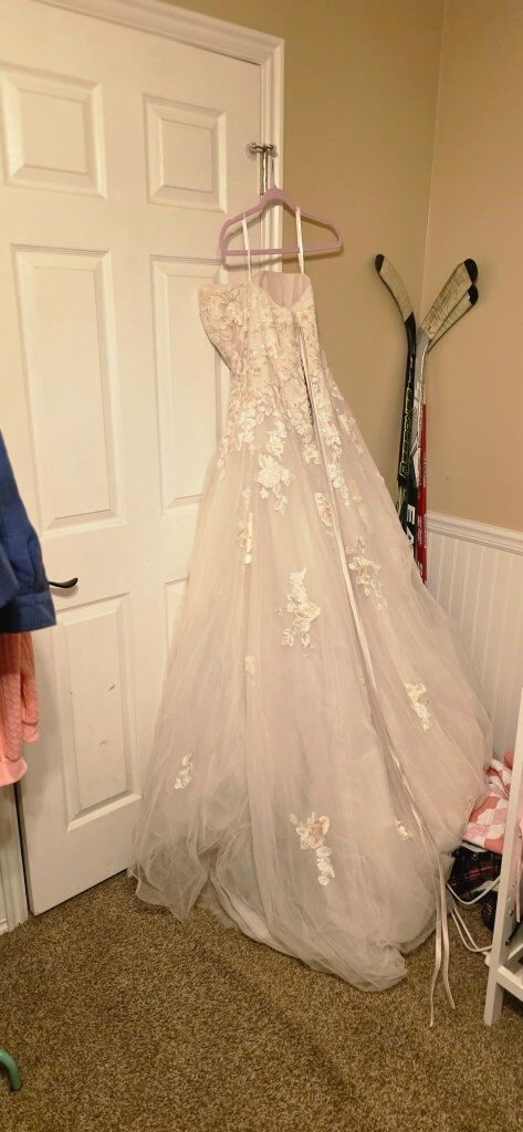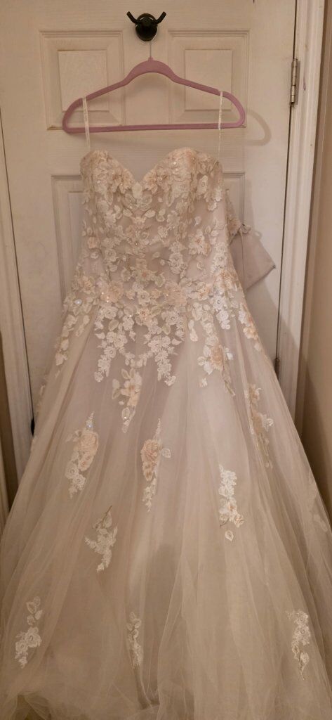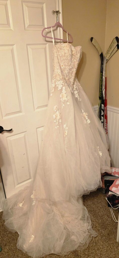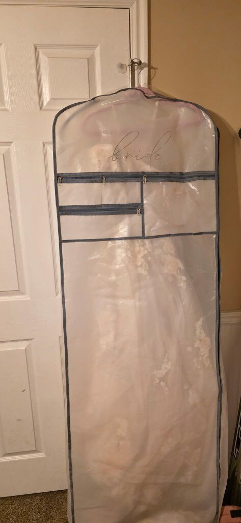 I am selling my wedding dress. It is size 12. I wore it back in 2022 and it was only worn once and has been in a protective bag since then. I got it from David's bridal for $800 so I am asking $300 OBO.