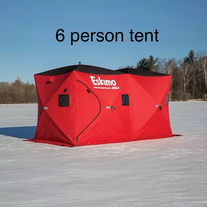 $80 - 6 man tent package. Includes the tent, a sled, three poles, three chairs, ice scoop, buddy heater (you must provide your own propane), and ice auger (either a hand auger or an auger with a drill attachment (you provide your own heavy duty drill).