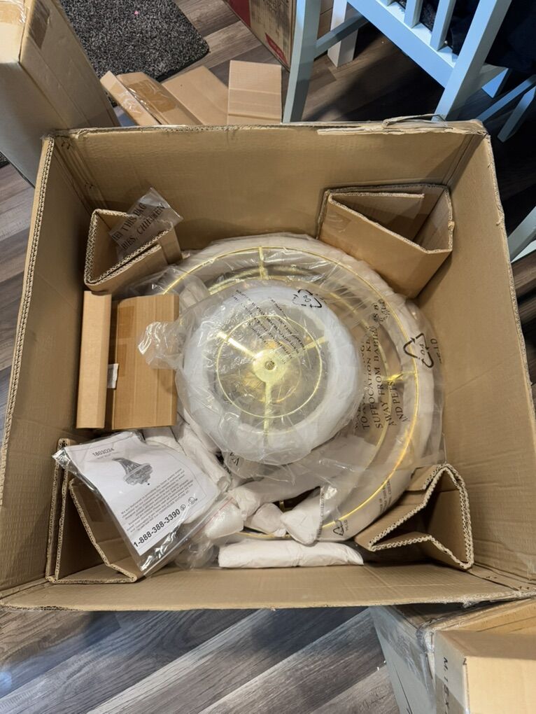 Brand new crystal chandelier, never installed, still new in the box but box is opened. Model 1803D24 – looks like a classic tiered gold crystal/champagne style chandelier.