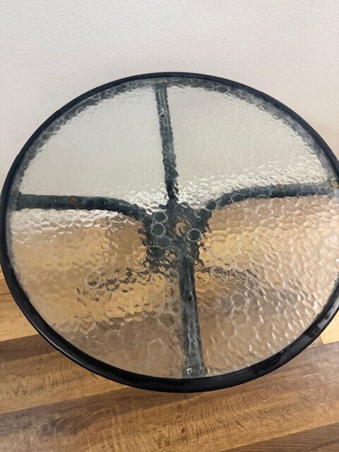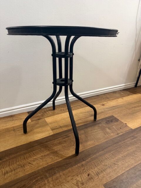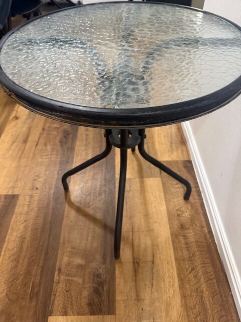 VenmoGlass and metal frame outdoor table. Great condition. Dimensions are: 28" high 24" wide