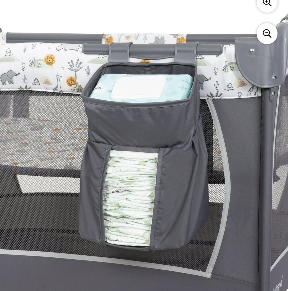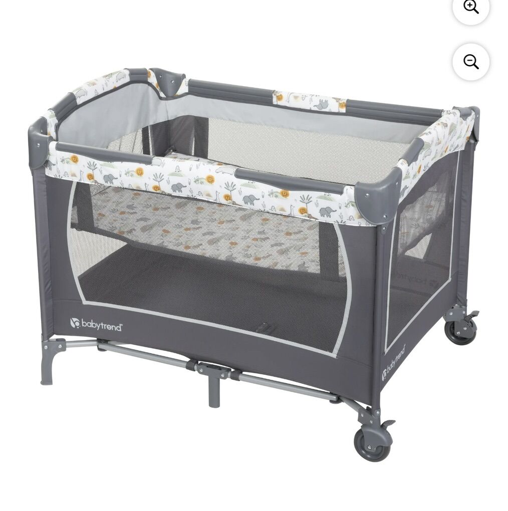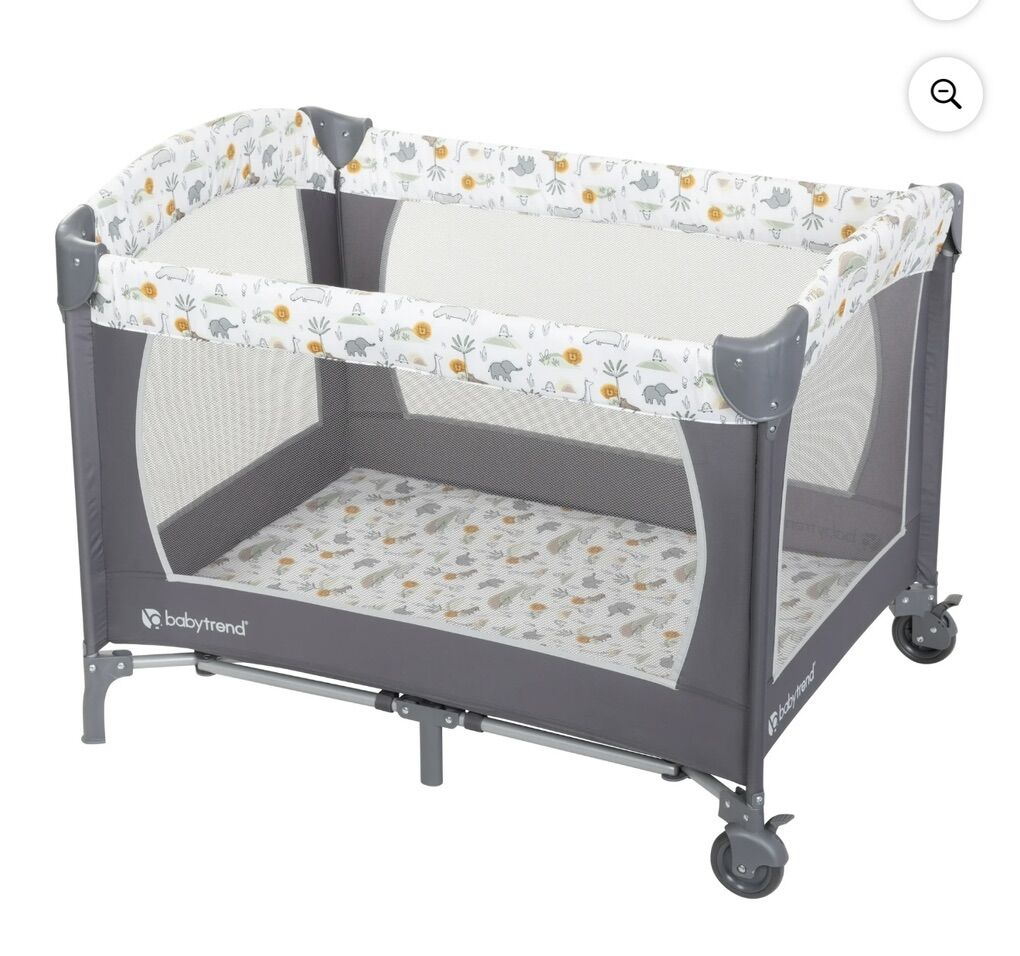 Removable Baby Trend lay-flat full bassinet • Enhances eye-hand coordination with 3 adorable toys to reach, oat, and grasp • Diaper stacker for convenient storage • Travel/storage tote bag included • Equipped with wheels and brakes for easy mobility and safety • Suitable for infants; grows with your baby