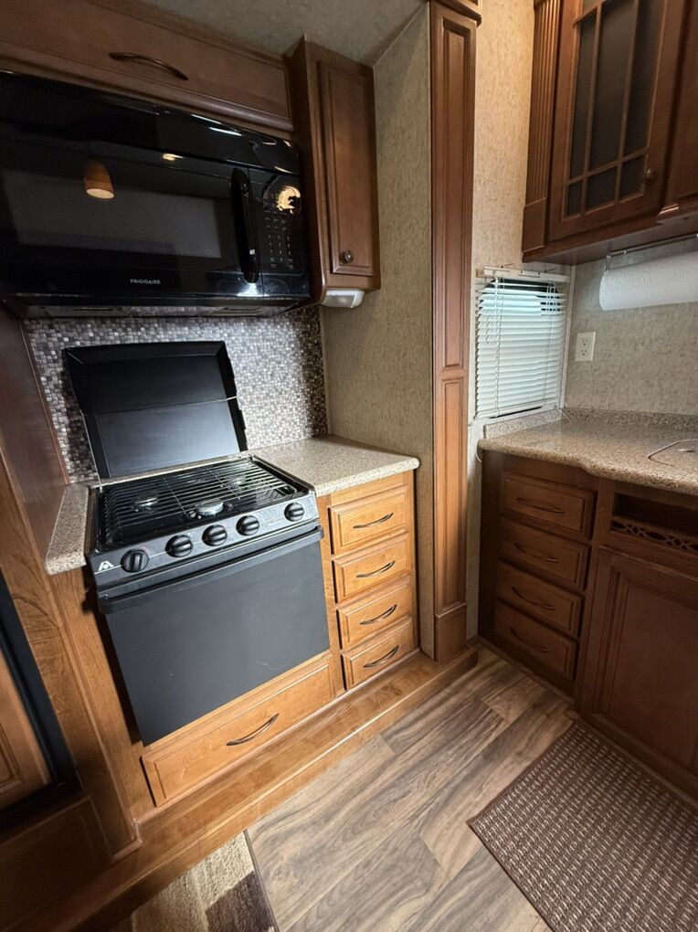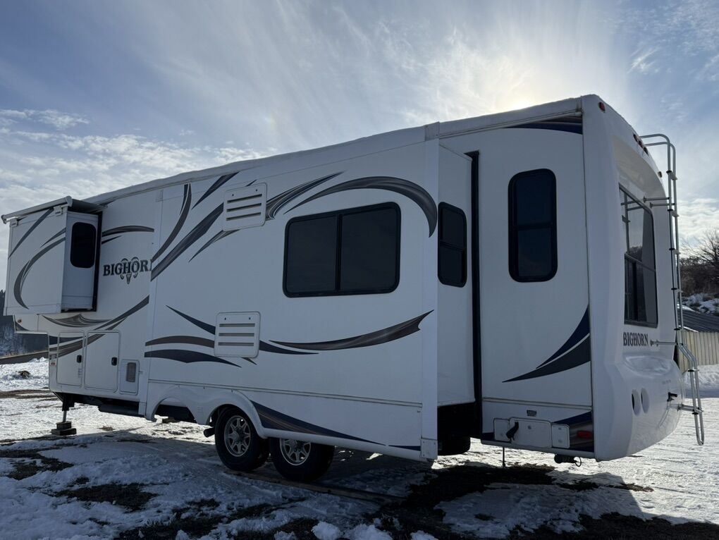 -solid surface countertops -stored indoor/covered most all the time except currently. -Large closets and storage space under bed -massive storage space under trailer in storage compartment -new batteries -brand new awning/automatic -Hydraulic power jacks -No water damage/leaks -tires are in great shape -no roof leaks or soft floors, solid trailer -TITLE IN HAND