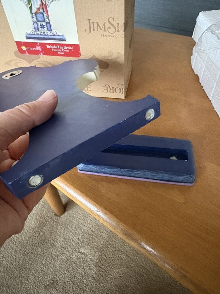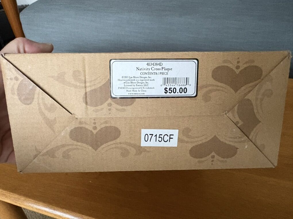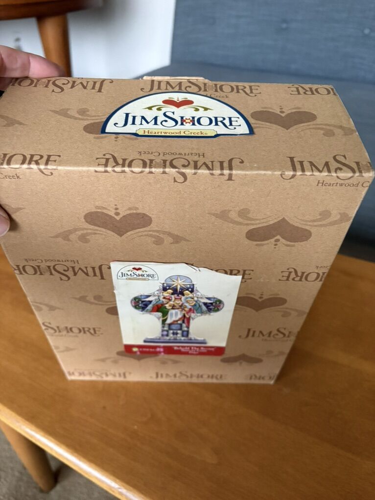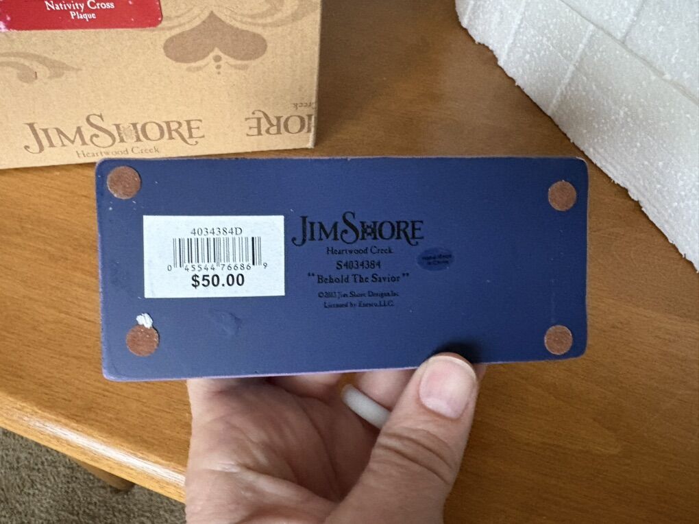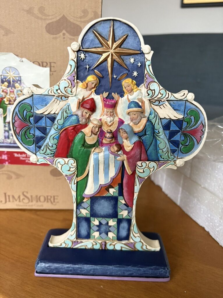 NEW (in original box) Jim Shore Heartwood Creek Enesco "Behold the Savior" collectible figure, 2013. Hand carved and painted resin, 7” tall. Beautiful colors & detail, Christmas Nativity cross plaque set in stand. NEW condition, in original plastic and box. Text only. Cash or Venmo.