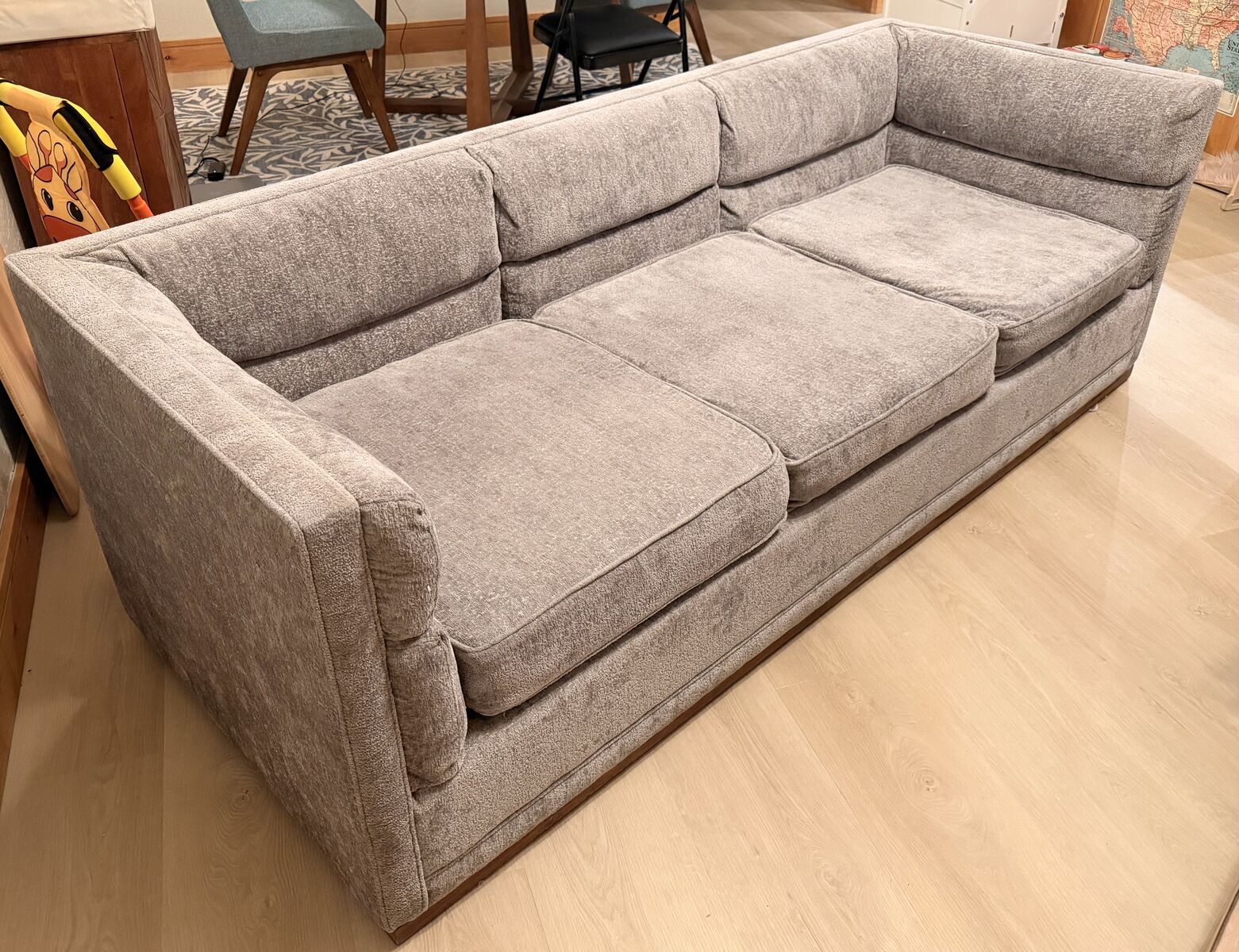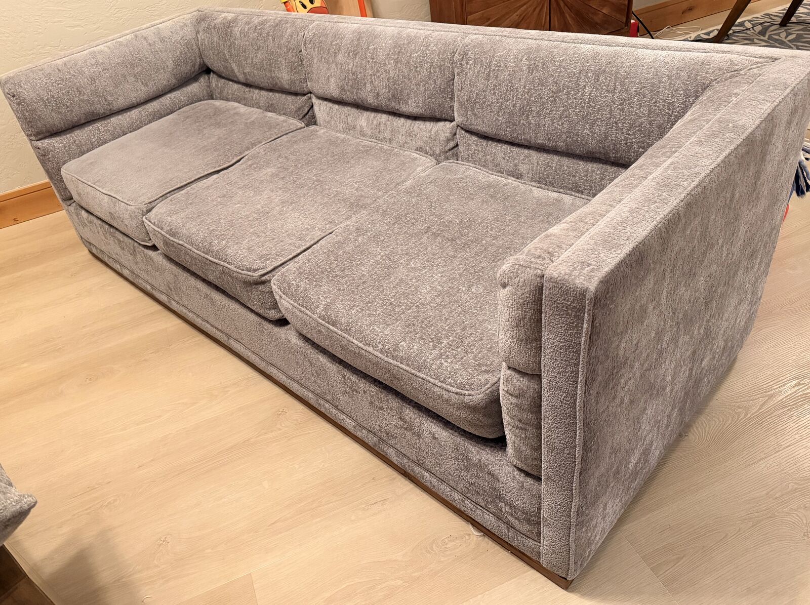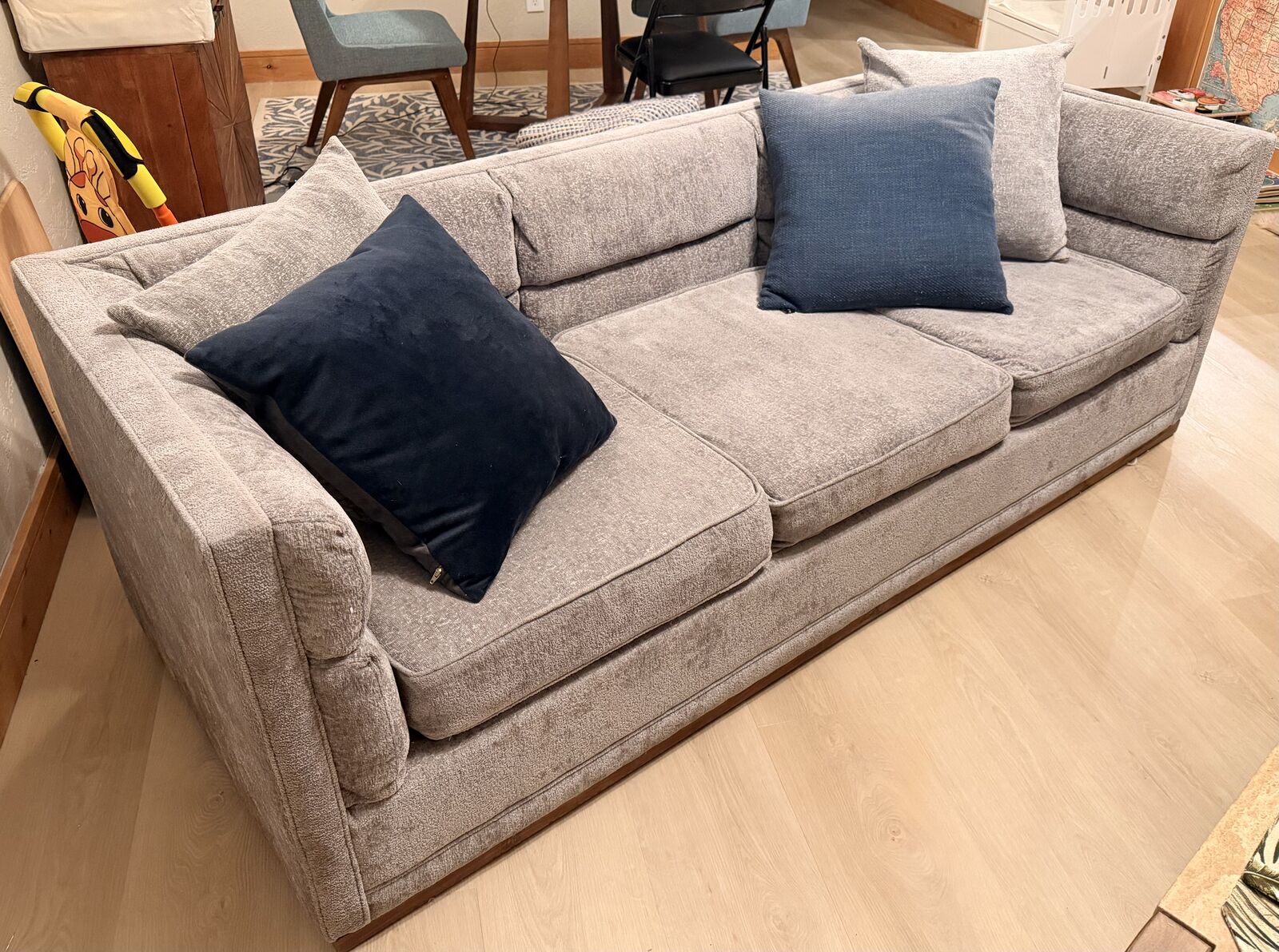 VenmoUnique grey sofa with wood bottom, purchased last year from a boutique in town. Pillows included. We've enjoyed this couch but wanted to upgrade to a sectional.