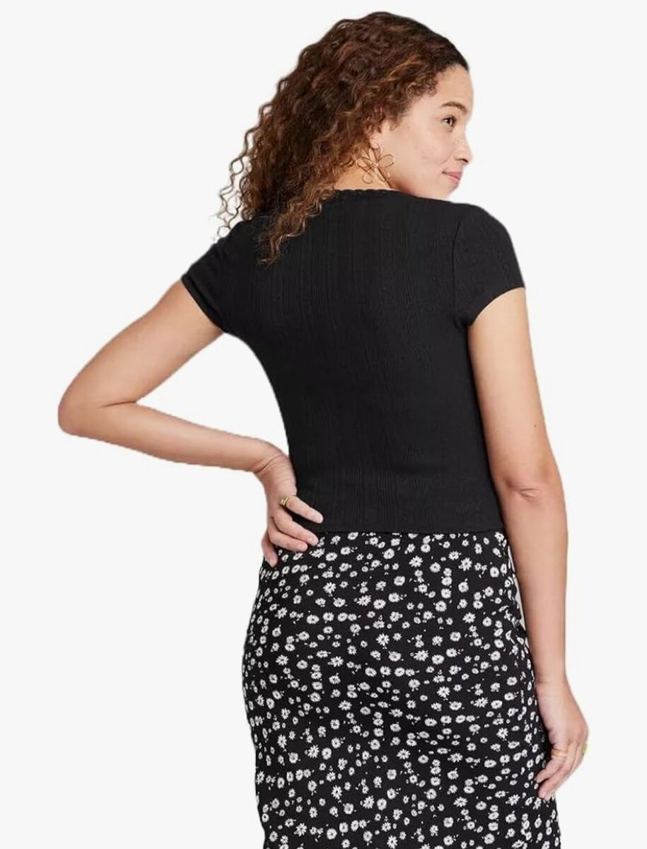 ZelleThe Wild Fable Women's Short Sleeve Pointelle Rosette Black T-Shirt in size XS is a stylish and versatile addition to any woman's wardrobe. This pullover shirt features a solid black color with a flattering pointelle rosette detail, making it perfect for casual occasions year-round. With a regular fit and machine washable design, this T-shirt is both comfortable and easy to care for. The Wild Fable brand ensures quality and style, making this shirt a must-have for any fashion-forward woman.