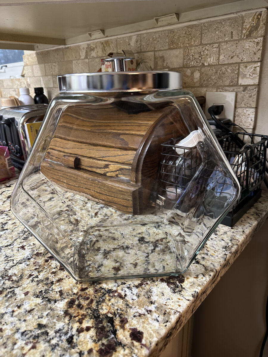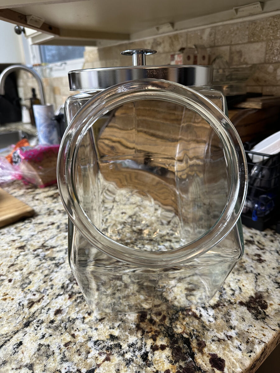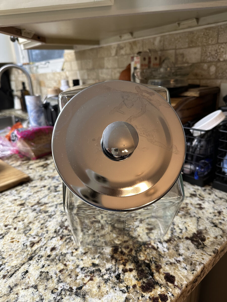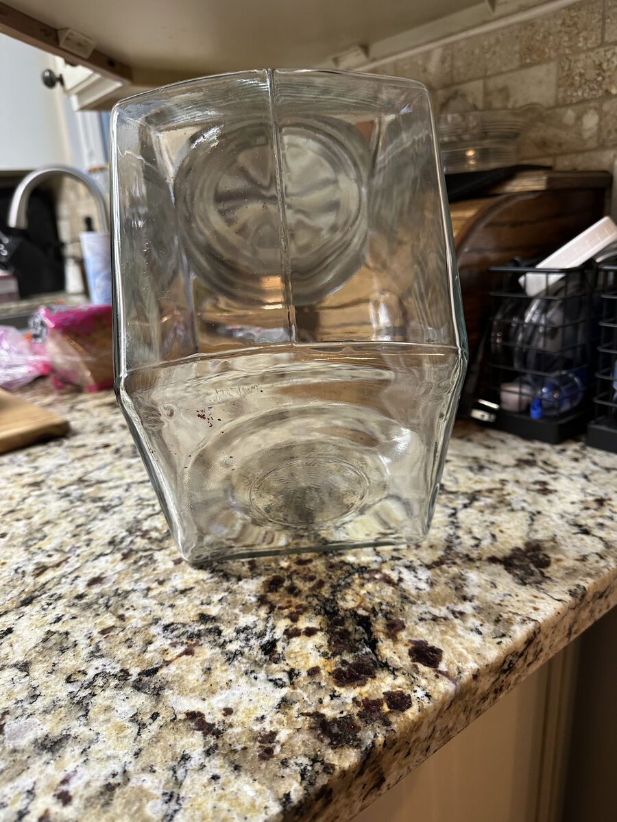 VenmoLarge Hexagonal Glass Counter Canister with metal lid. For Flour, Sugar, Cereal, Cookies, Muffins, doggie treats or Kitty Crunchies. Maybe even a goldfish! Can be used with the lid on the top or on the side. 12.5" Tall with lid on top, 10.5 with the lid to the side, Each side is 6" in length. 6.25" wide and 11.5" from corner to corner. No scratches or dings.