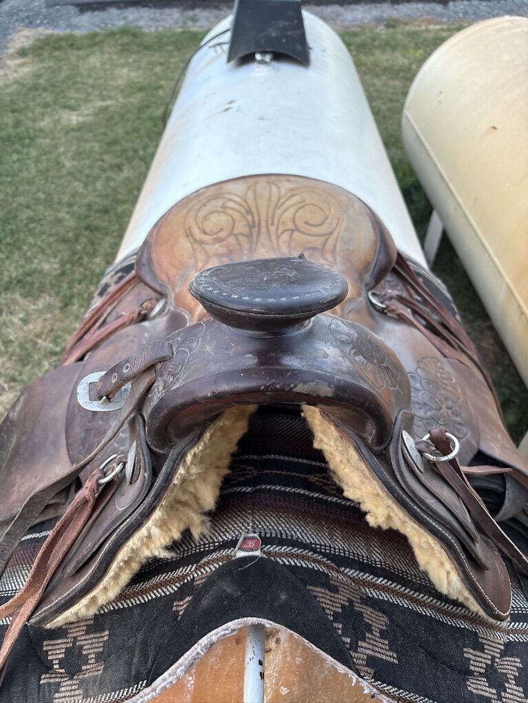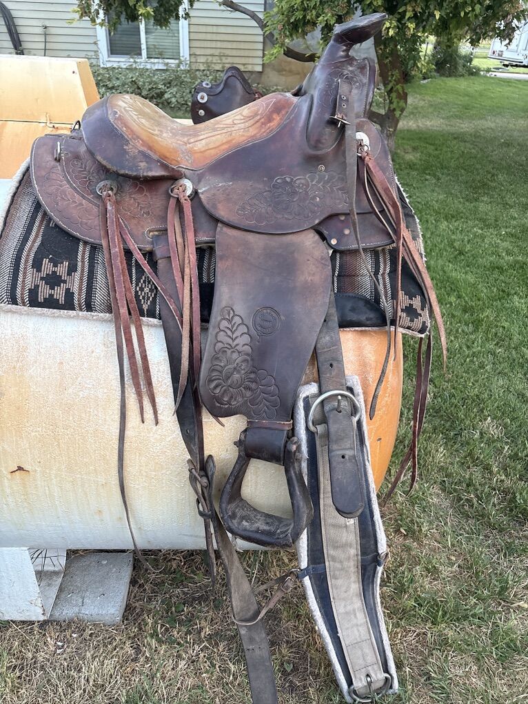 15 inch Colorado saddle company western saddle with 7 inch gullet. New real sheepskin with leather covered quick change stirrups. Rawhide covered wood tree. Rigged and ready to ride. Located 7 miles south of Logan. Well made saddle. 450.00
