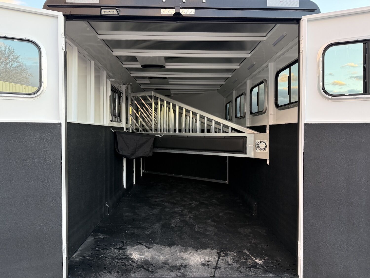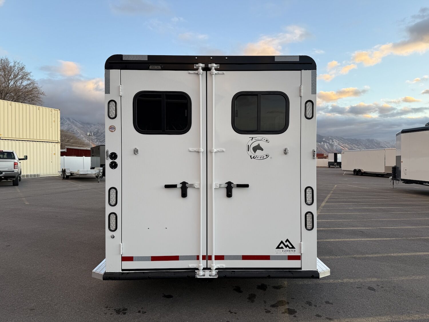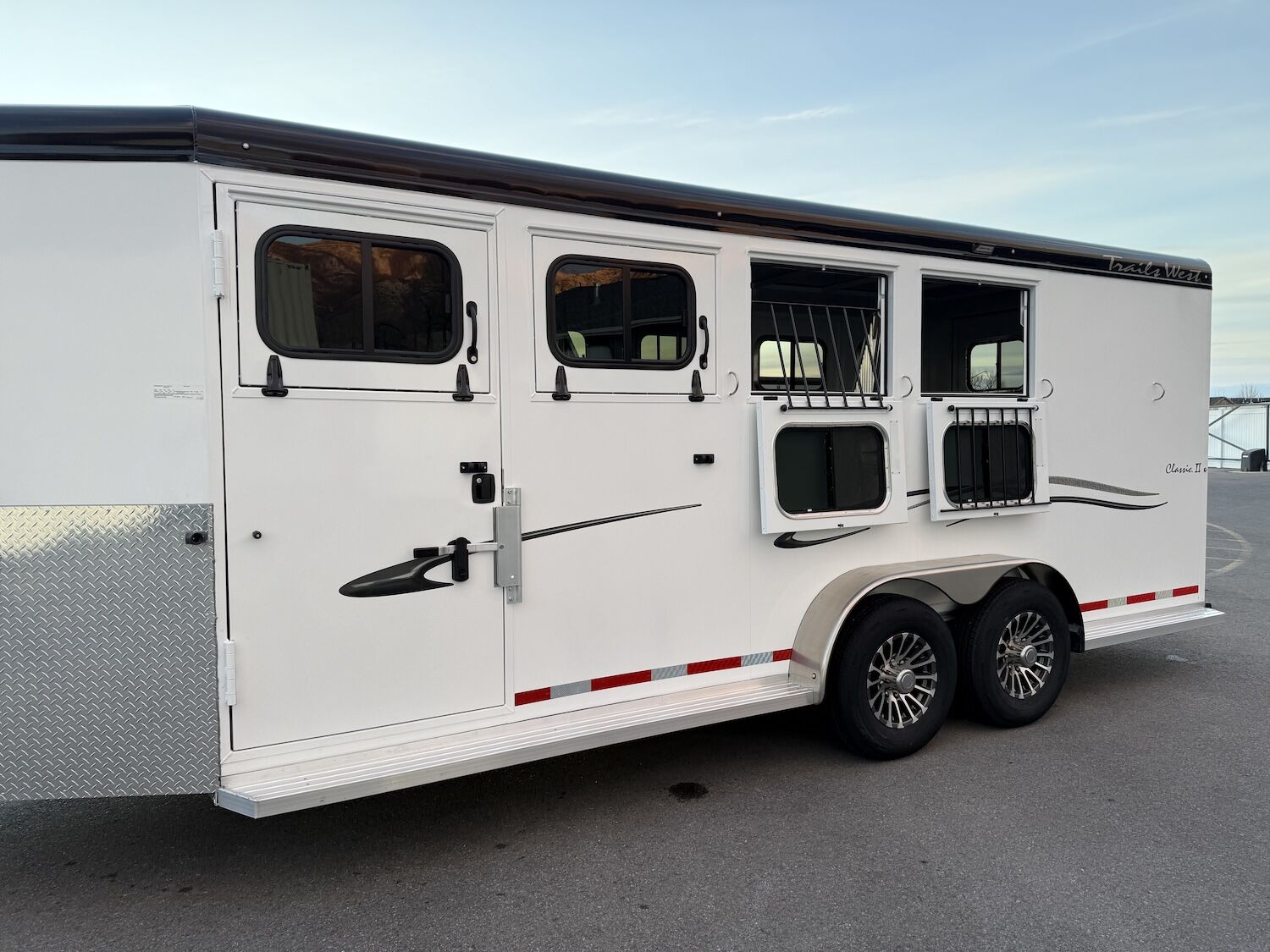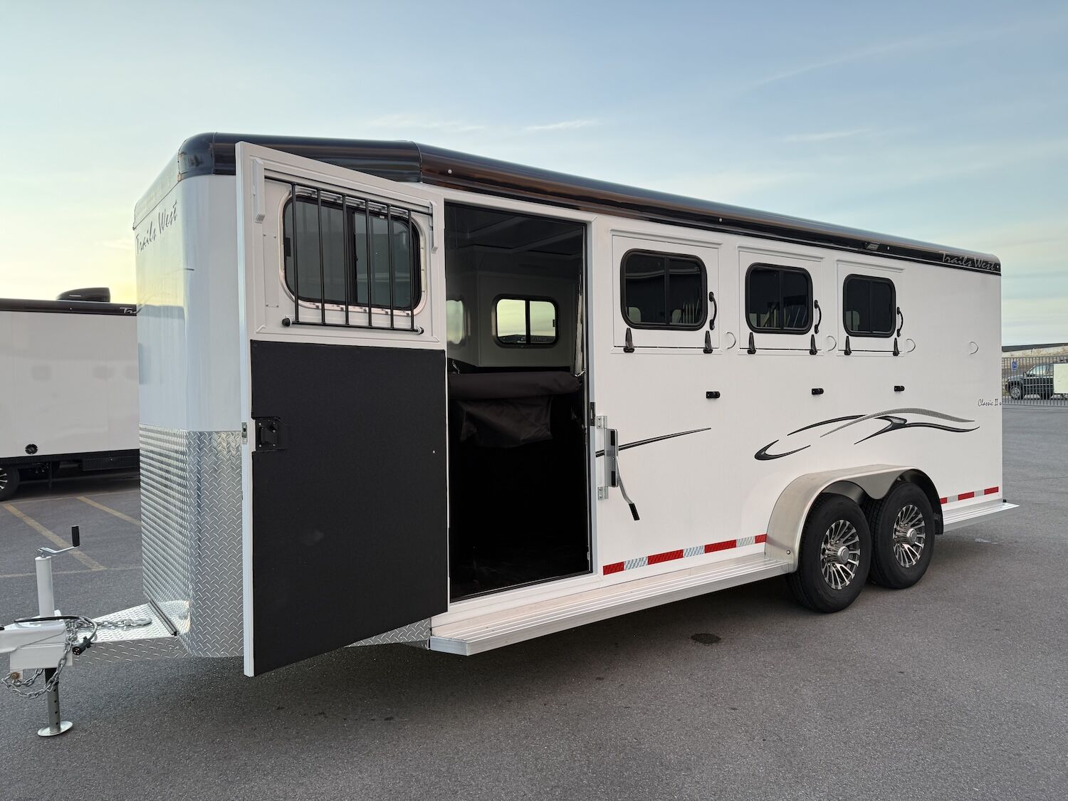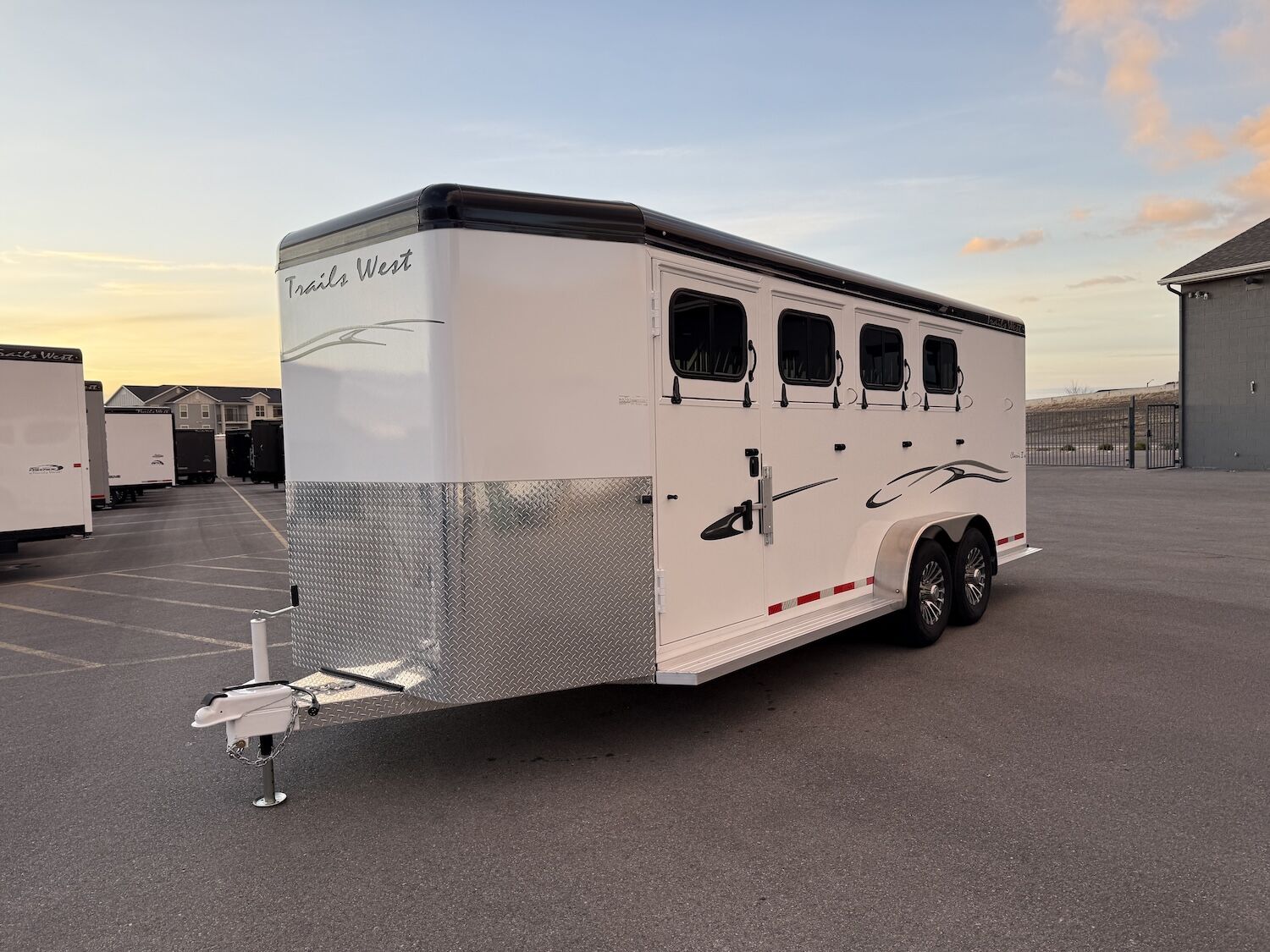 The Trails West Classic model is constructed with a steel frame and aluminum skins. It’s 7’0″ wide, and 7’0″ tall and comes standard with custom drop-down feed doors with face grills on the head side, sliding windows on the tail side, and a roof vent in each stall. The large 41″ stalls provide plenty of room and comfort for your horse and feature the industry’s best slam latch divider system. The tack room is roomy and functional and features their state-of-the-art swing-out saddle and blanket racks.