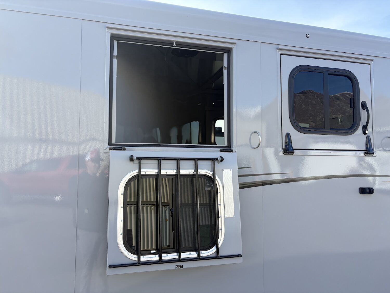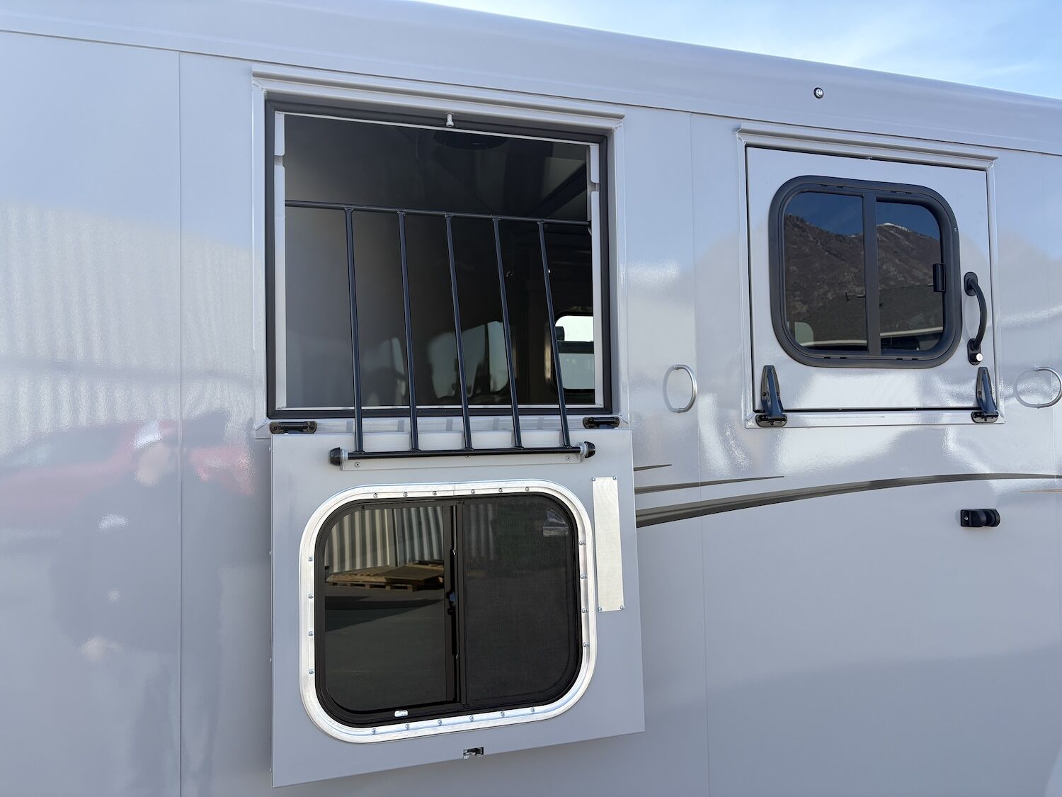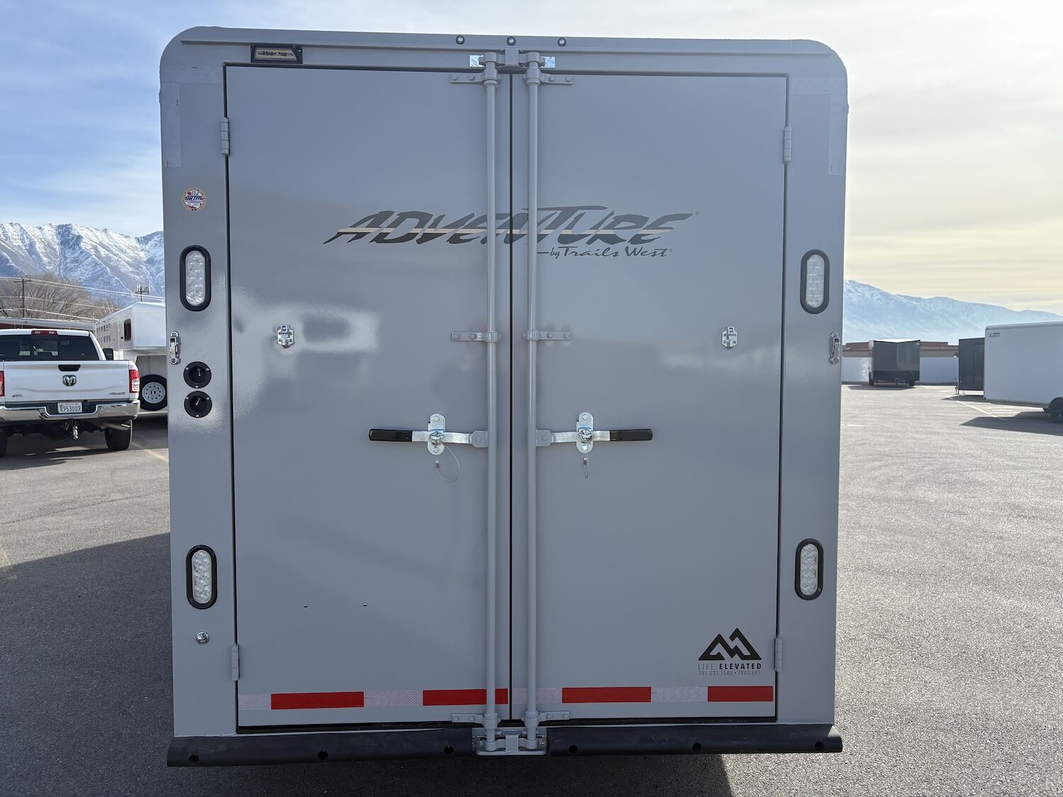 The Adventure MX trailer from Trails West is the best priced steel framed aluminum skinned trailer in the industry. It has the perfect combination of style, user friendly features, and value. This trailer has newly designed aerodynamic front, head side drop down feed windows, tail side sliding windows and rubber wall mats all the way around the horse compartment making it the best equipped trailer in its class.