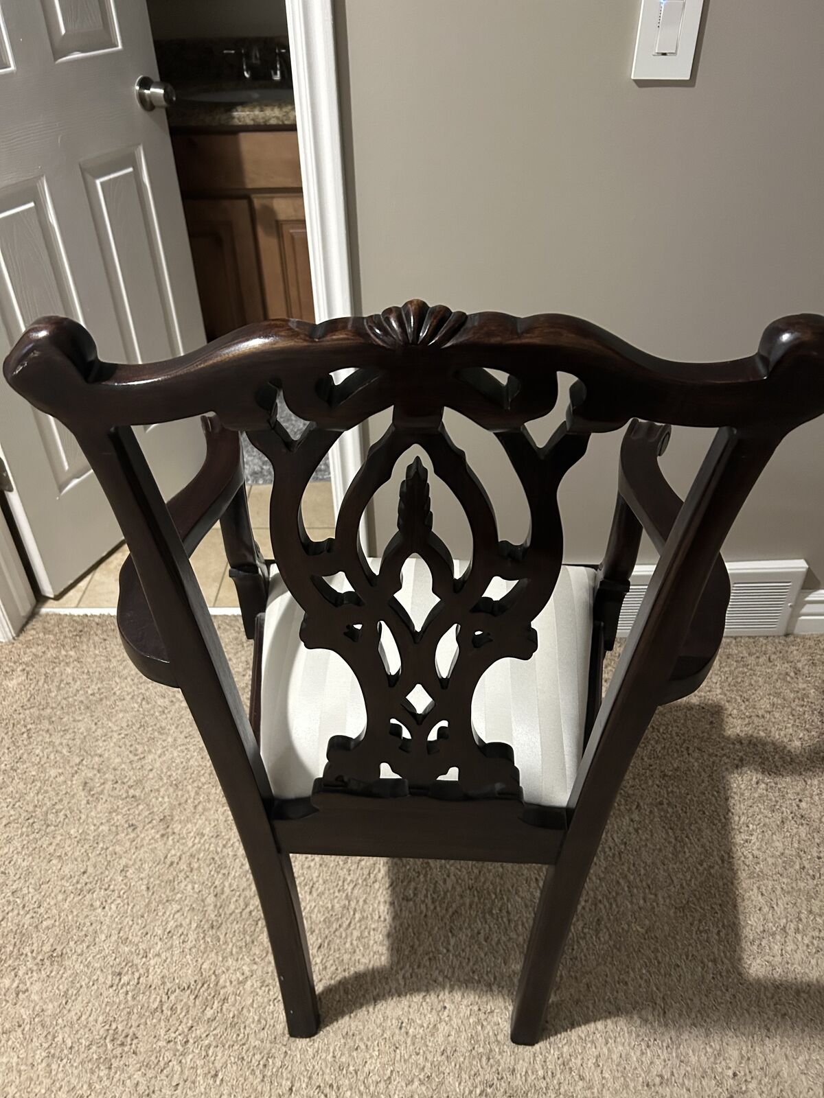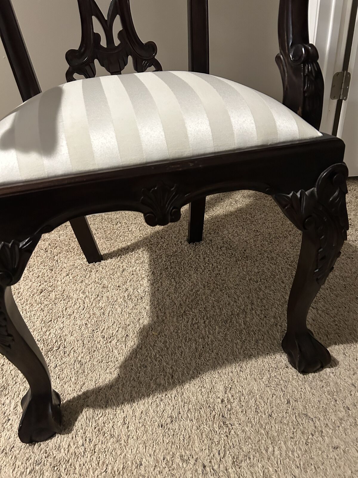 Rich dark wood finish paire with neutral striped upholstered seats. Perfect for a formal dining room, living room, office, or accent seating.