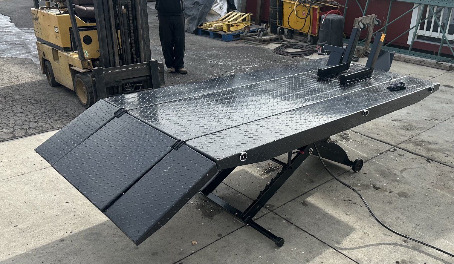 Capacity: 1,000 lbs (454 kg). Operation: Air-powered (requires 100 PSI). Dimensions: 93" total length (with ramp, 113"). Width: 24" (base), 48" with included 12" side extensions. Rise Height: 33".