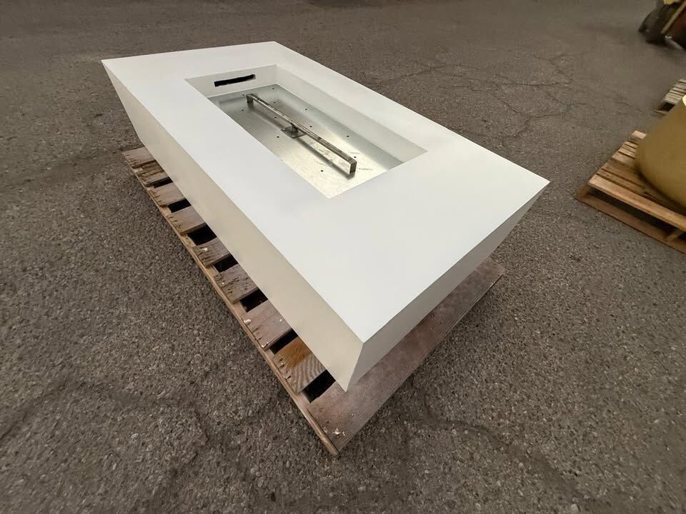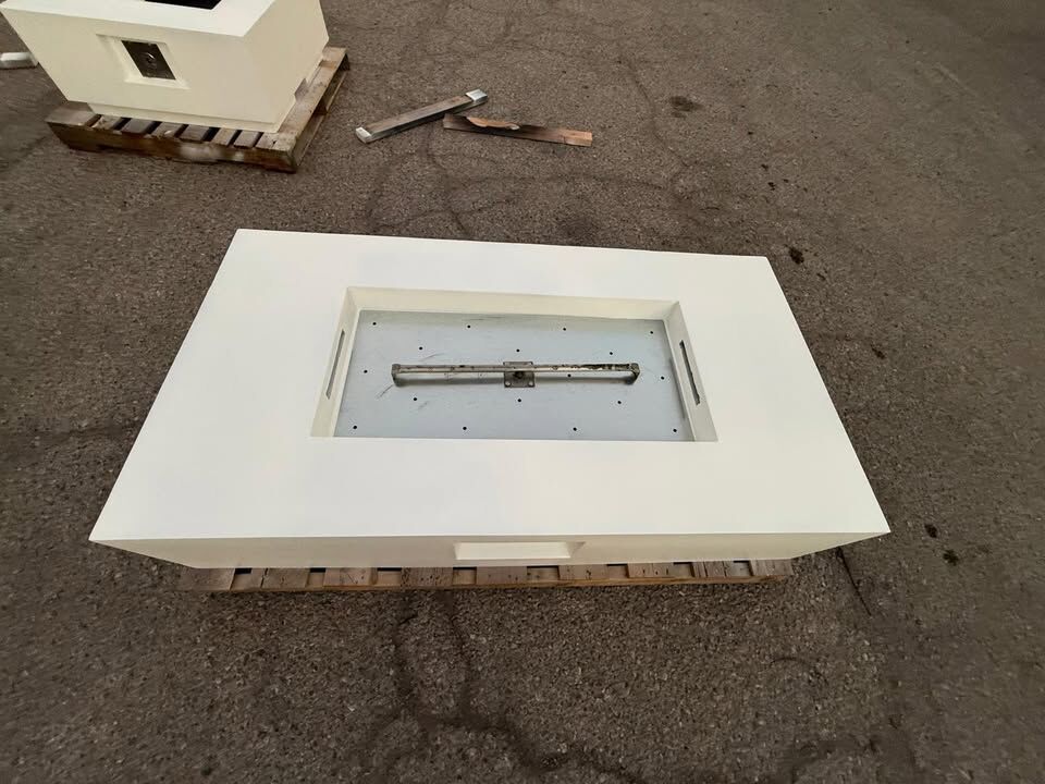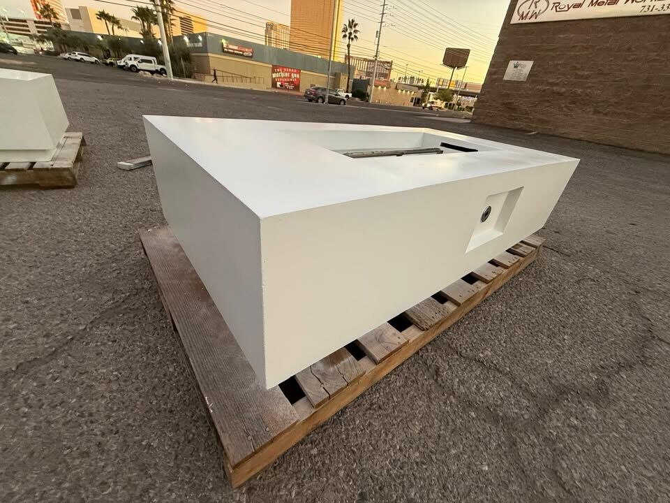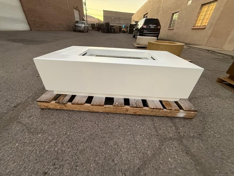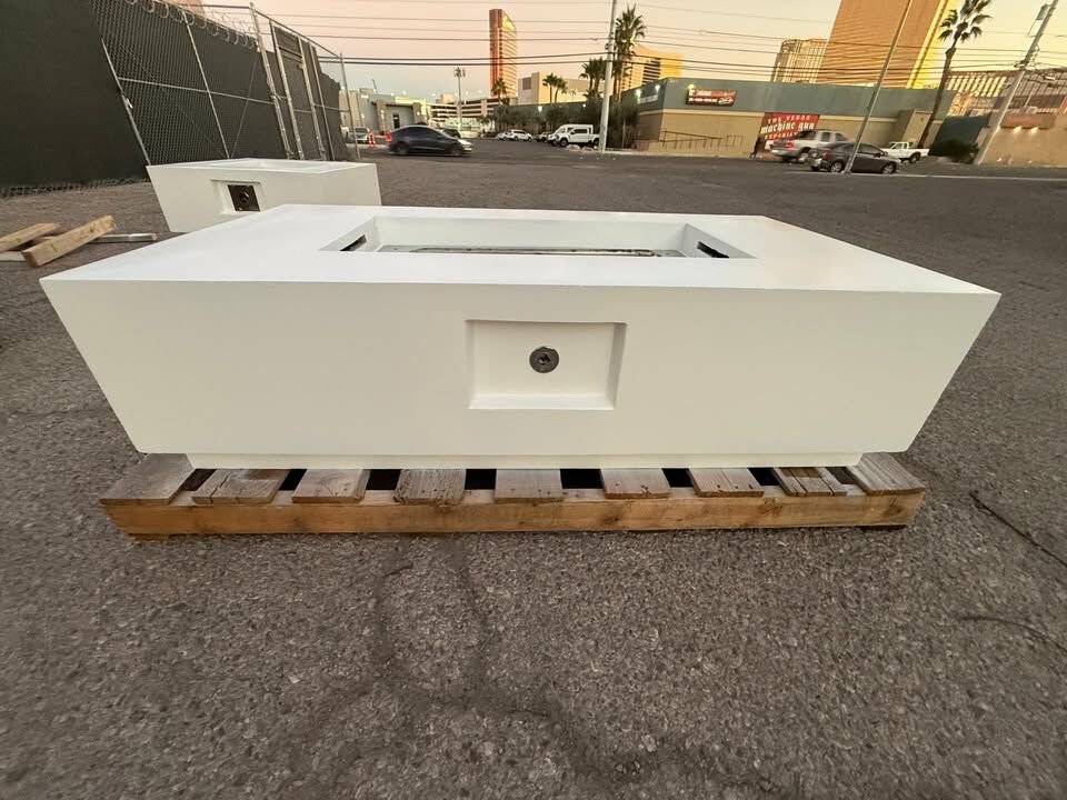 ZelleHigh-quality outdoor fire pit constructed from GFRC (Glass Fiber Reinforced Concrete) with stainless steel components.