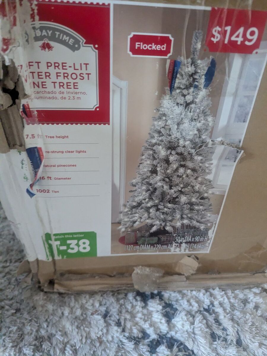 Downsizing- this is a great 7.5 flocked and lit Christmas tree with pine cones. $100 OBO All the lights work, comes with ribbons, Vintage Martha Stewart glass ornaments (1999) wreaths, miscellaneous decoration pics and a electronic Snowflake Christmas tree topper ($30 alone) Would also be a great tree for the Festival of Trees.