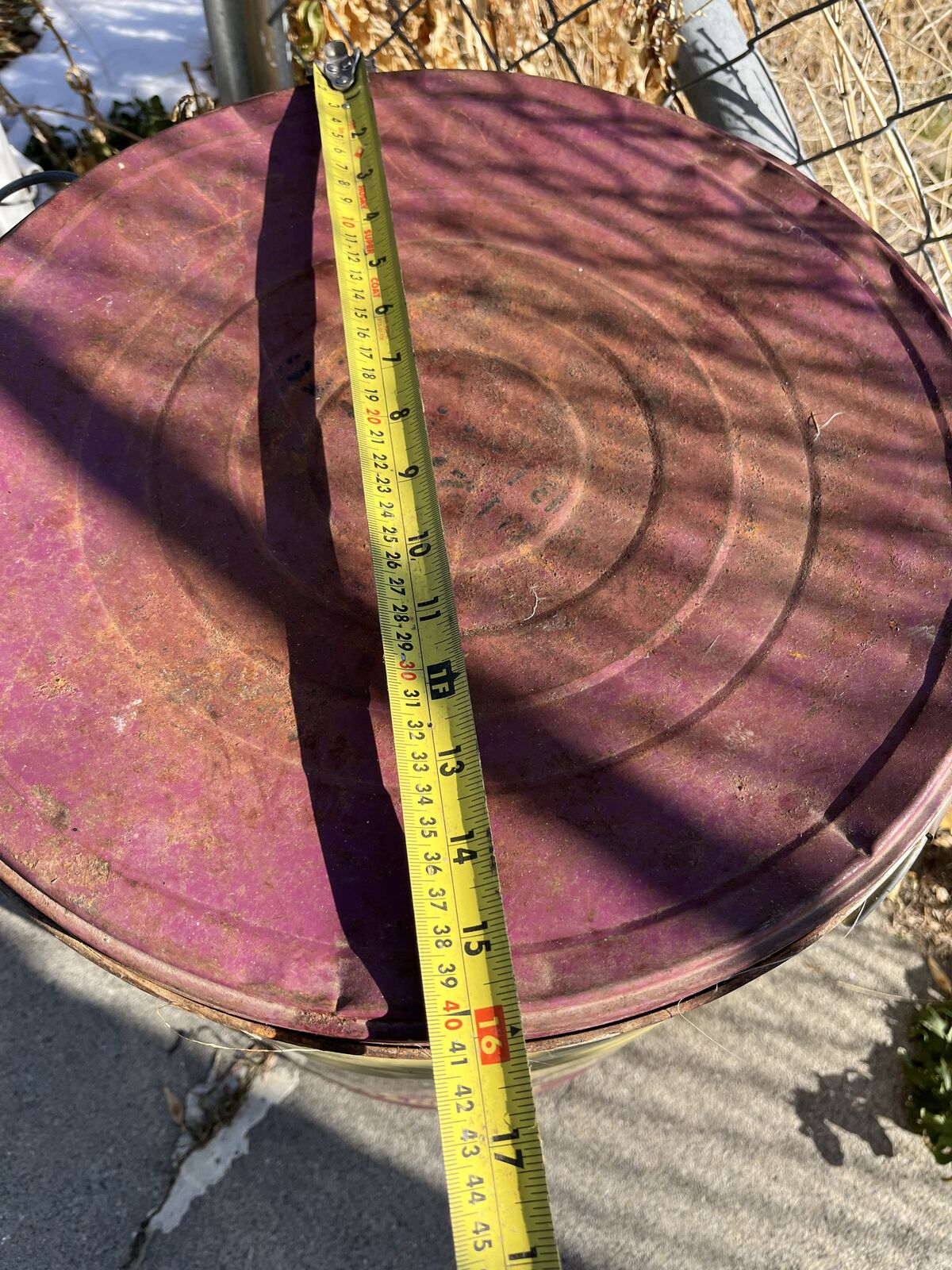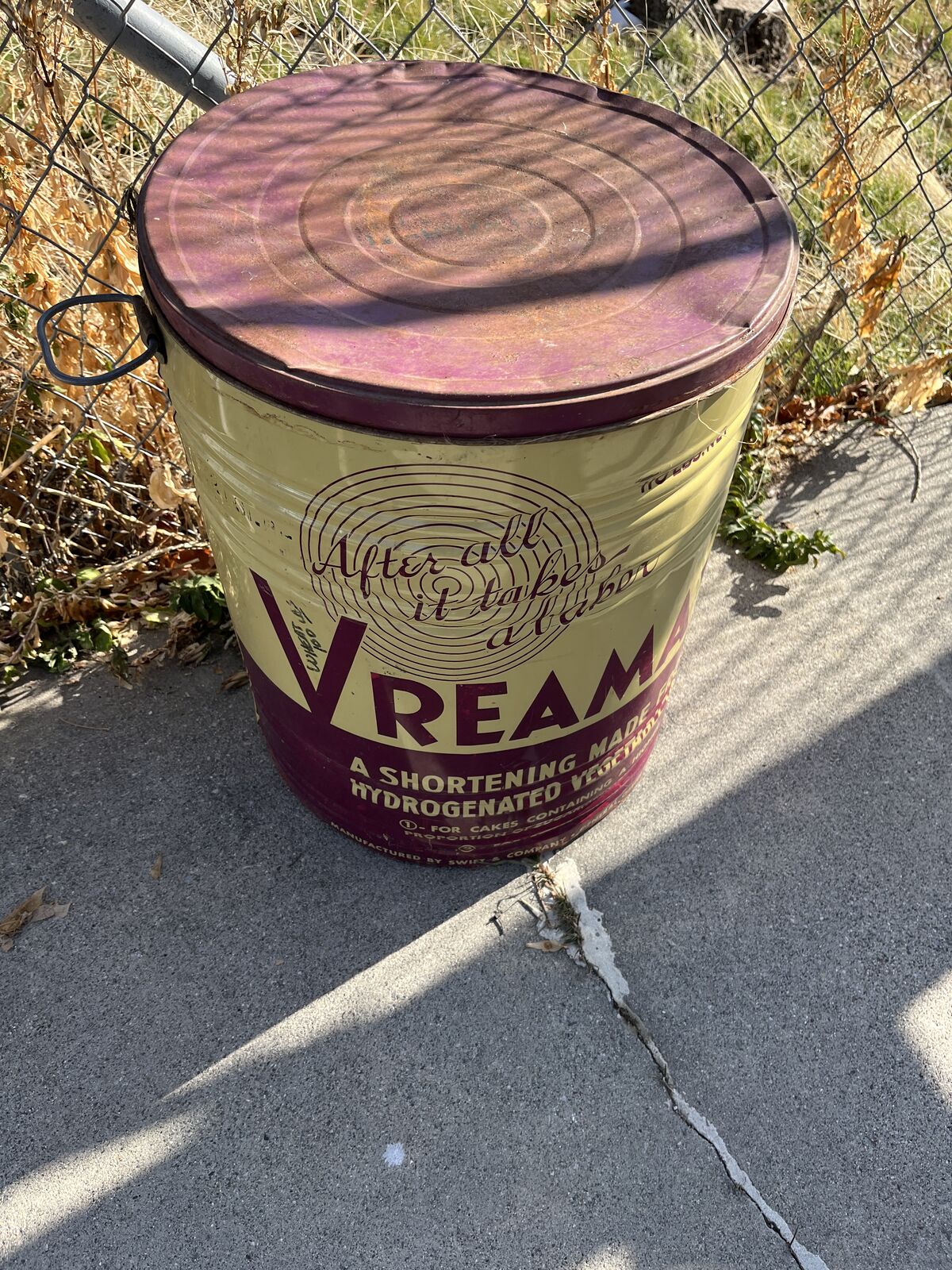 Venmo"Vreamay" shortening old fashioned can; 16 in. diameter; 20 in. tall. In pretty good shape you can see; clean inside; we were recently using for grain storage. Been stored under a roof. $20 obo