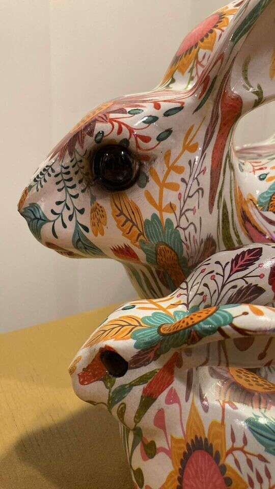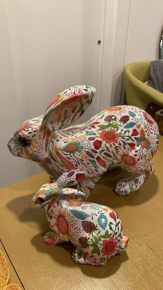 PayPalThese are truly beautiful. New floral covered light weight resin Easter Rabbit Set. Big rabbit is 14 in long x 9.5 in tall x 6 in wide. Small guy is 5 in tall x 3.5 in wide. Will make an space happier and more colorful throughout spring or summe! $39 for set.
