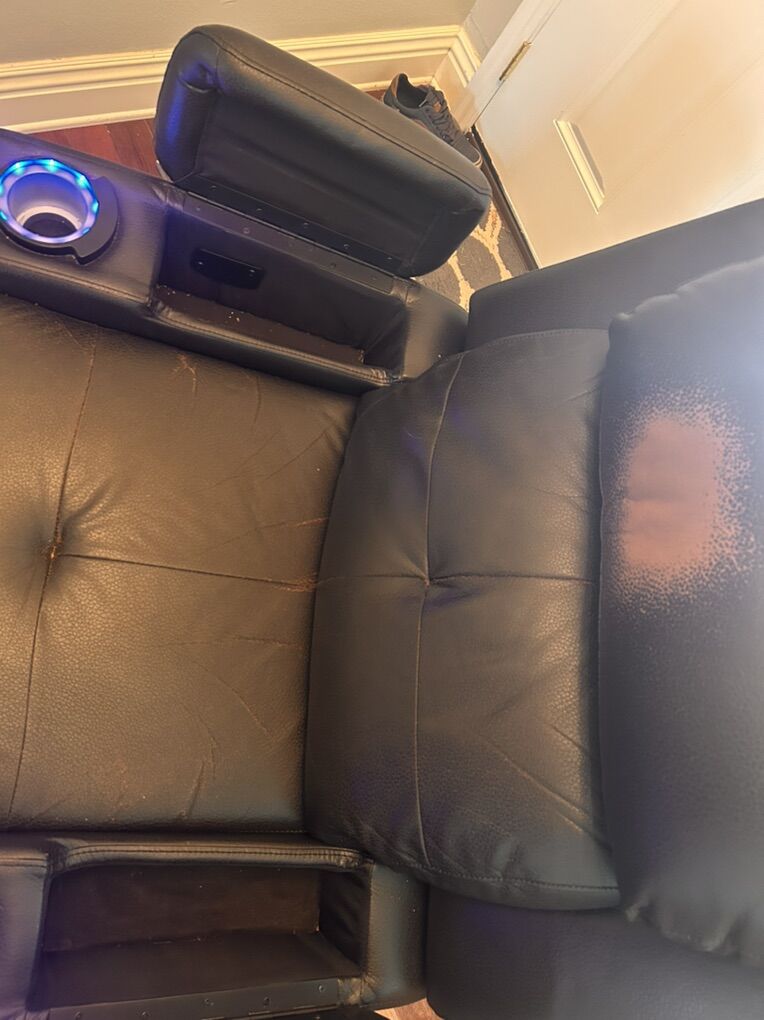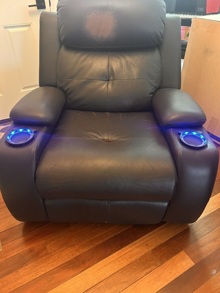 ZelleElectric button press recliner well loved but all mechanical parts work great. Adjustable head and foot rests. Arm rest storage compartments and cup holder LED’s. Free We got a new one and don’t want to throw it out it just needs picked up
