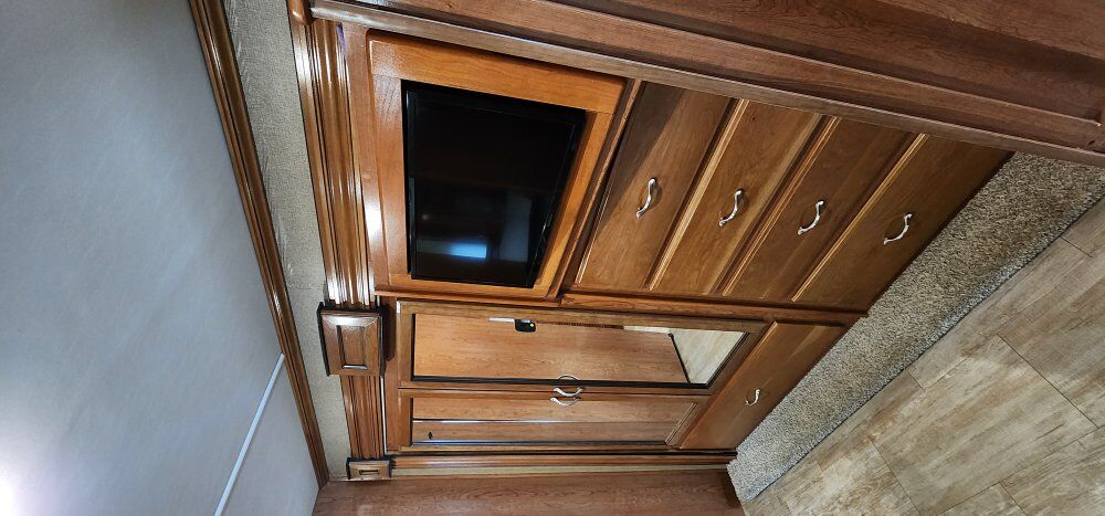 The rear part of the coach has a bed in a slide out with full dresser/drawers and tv in front along with a large rear bathroom