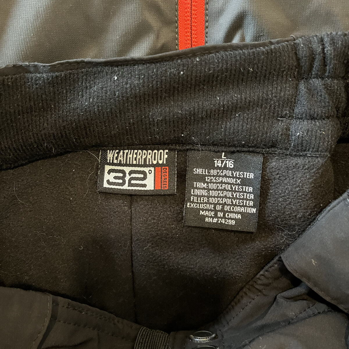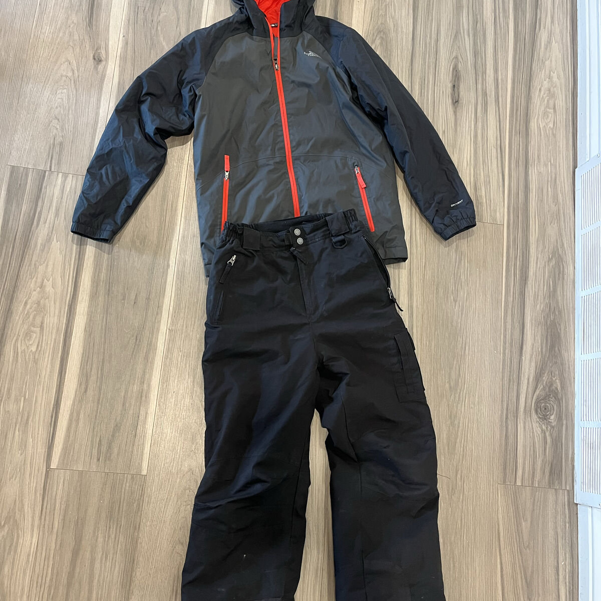 ApplePayLarge size 14 to 16. But my kid wore them at 13 yrs. Both in great condition. High-quality and ready for new owner. Ski jackets north face and a good shell waterproof. The pants are insulated and a different brand, but has zipper pockets and in good condition
