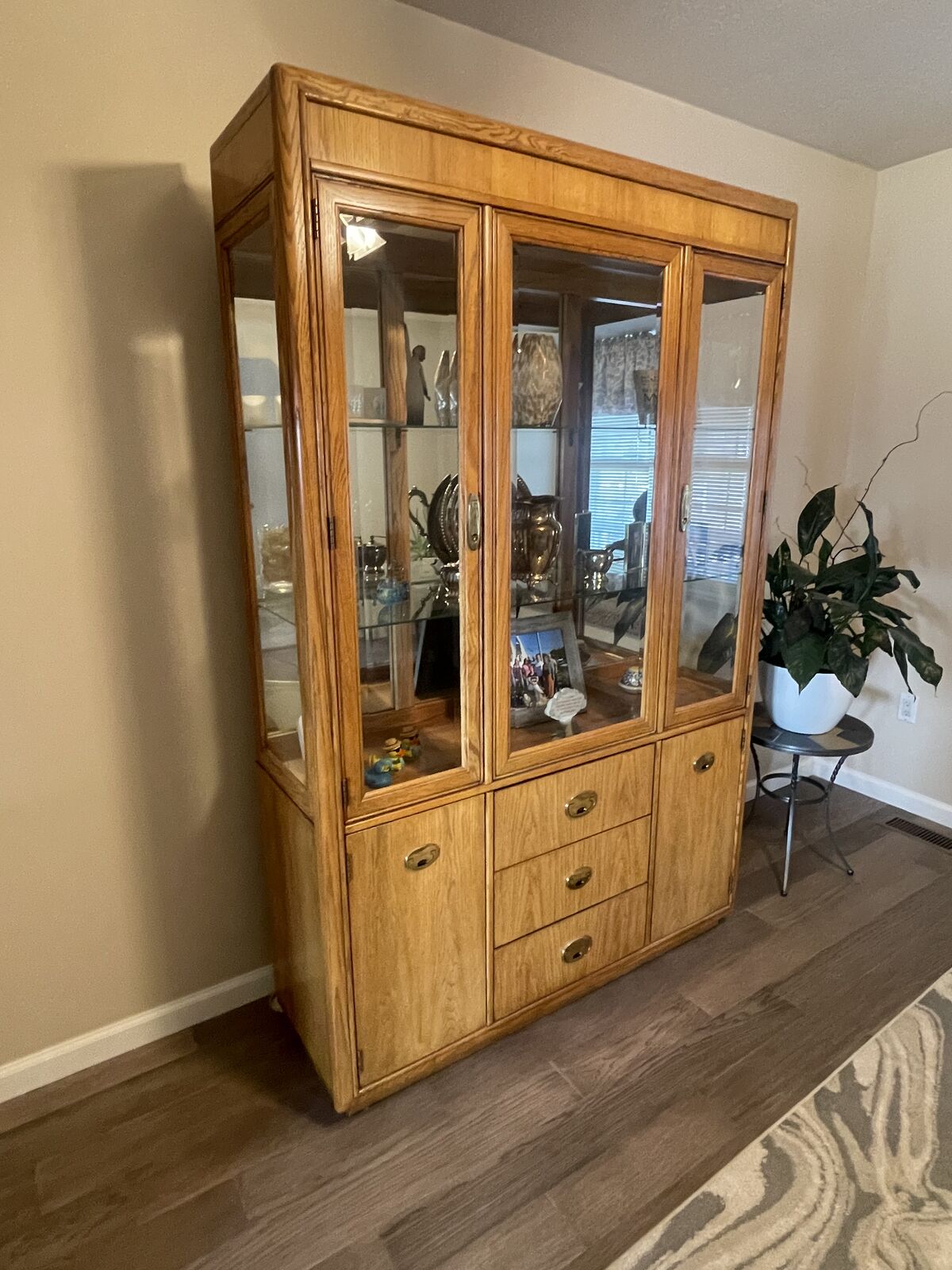 VenmoVintage Stanley China cabinet - one piece solid oak in excellent condition. 80" H x 52" L x 16" D. Top has lighting and grooved glass shelves for displaying items. Bottom has three drawers and two cabinets for storage. No damage.