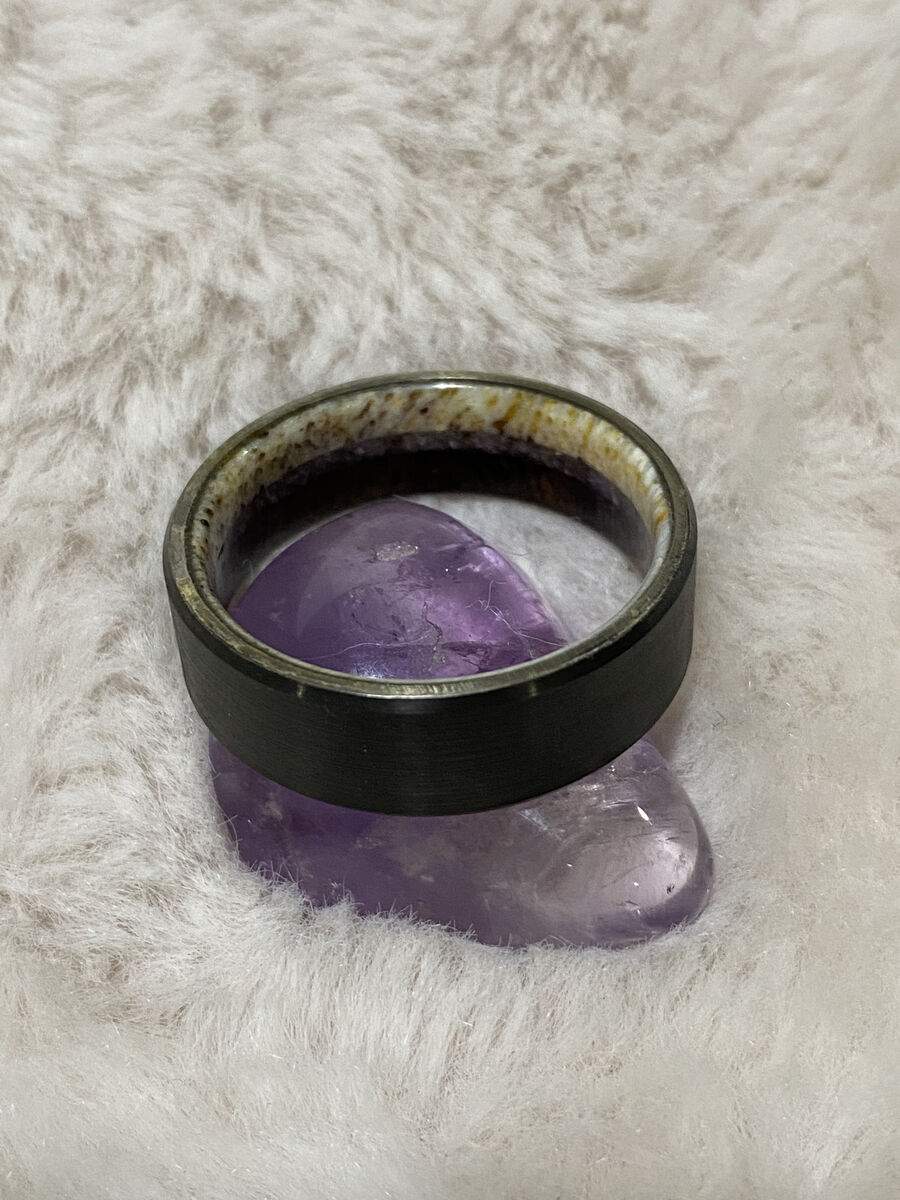 ApplePayBeautiful Black Zirconium Wedding Band with Wood, Antler, & Sugilite Sleeve. Simple and elegant on the outside, stunning and unique on the inside. One-of-a-kind. Retails for ~$700. Size 13.5.