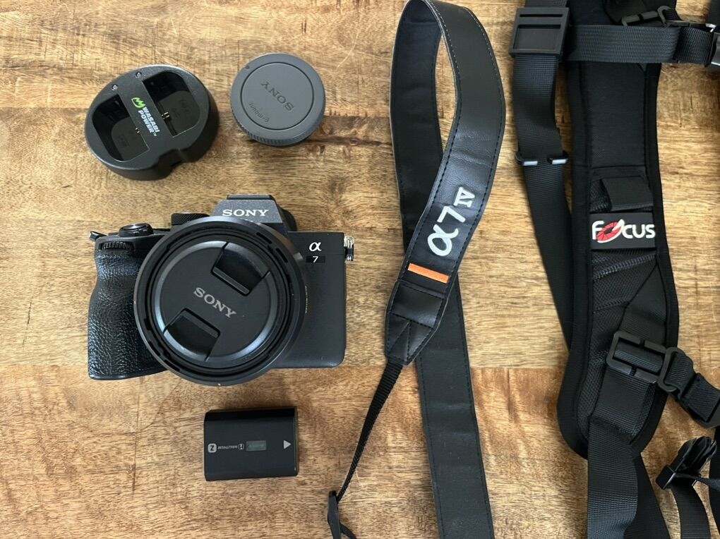 Sony A7IV camera body, Sony strap, focus backpack style double camera body strap, basics tripod, movo mic, body cap, charger, 2 batteries ($1800)