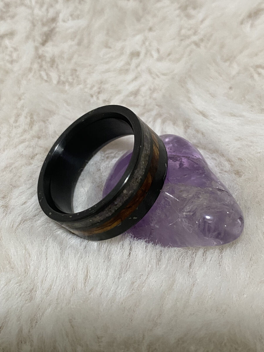 ApplePayBeautiful, unique unisex (wedding/anniversary) ring. Black zirconium band with sugilite and wood inlay. Retails for ~$700.