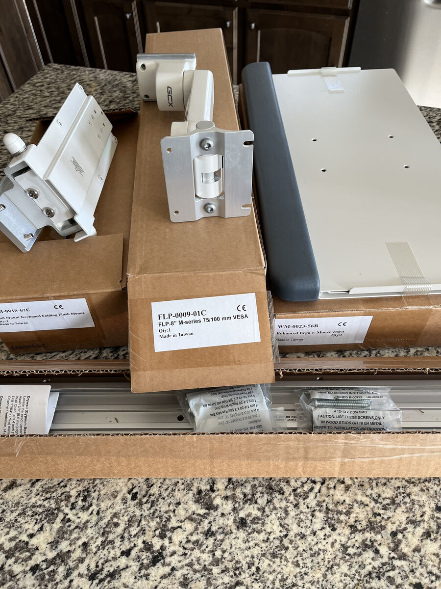 I have 8 of these complete systems that were going to be installed in a Dr's Office. These units were left over from the project. One box of each part was opened to take the picutes, all other boxes are factory sealed. All units include all the hardware for installation. The keyboard tray is the ergo model with the extended mouse trays. Im willing to let them go at $125.00 each or can work out a better deal if you want more than one. The model number of each piece is located on the box in the picture.