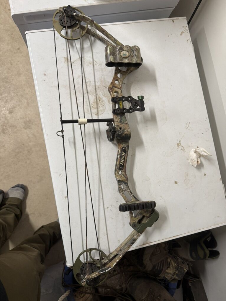 Bear apprentice youth compound bow. Currently set at 45 pounds but easily adjusted. Asking $100