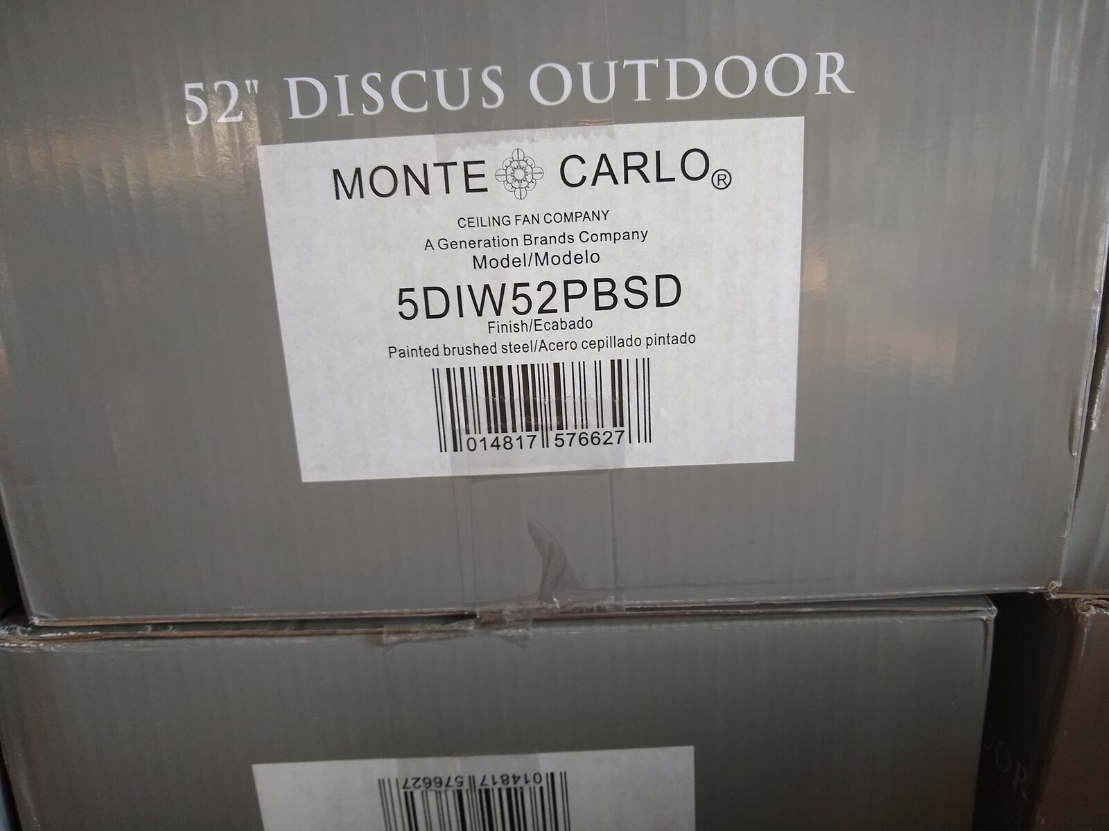 New Monte Carlo Ceiling fan Bruch Steel finish 52 inch Un-opened box. 75 +percent off I have 15 Retails $300-$370 each . Rated outdoor/indoor very nice looking fan.