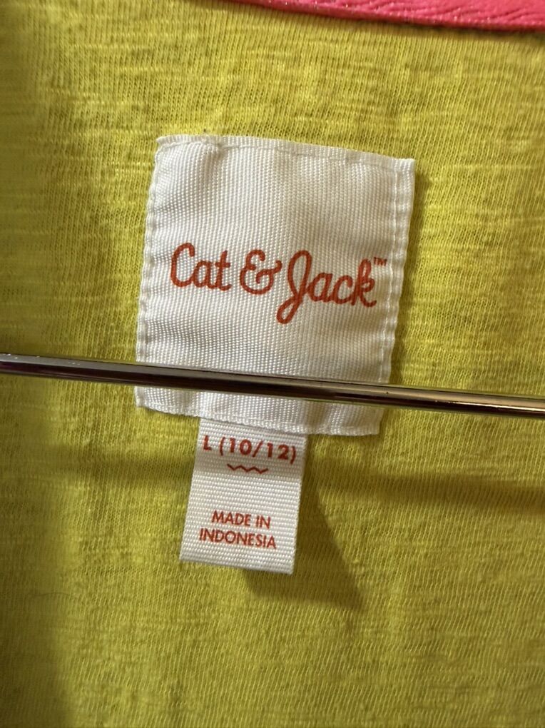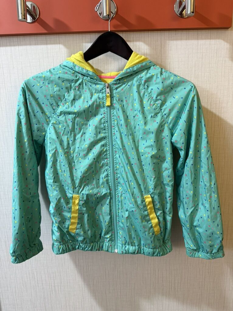 Cat & Jack kids' teal windbreaker jacket with yellow accents and a colorful sprinkle pattern size 10/12