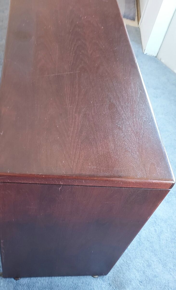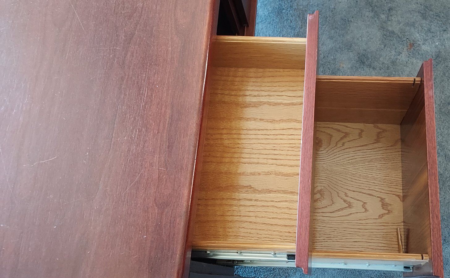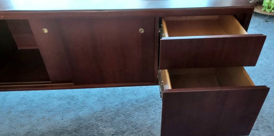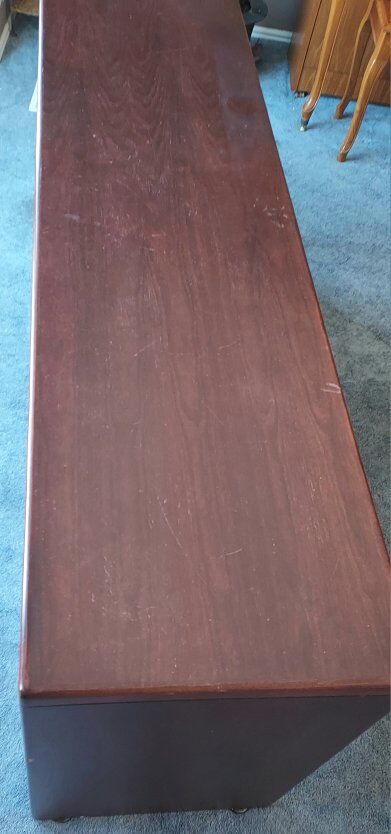 Beautiful hardwood 6' long side desk/credenza with a cherry wood finish. Not sure what type of wood it is, but it is well built and very solid, probably weighs close to 300 pounds. In good overall condition, but does have some Knicks and scratches, could use some refurbishing or refinishing. The drawers are well built and solid looks like hardwood bottoms, possibly walnut. Please text or message me with any questions, thanks At this time I can only except cash