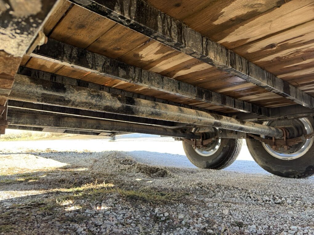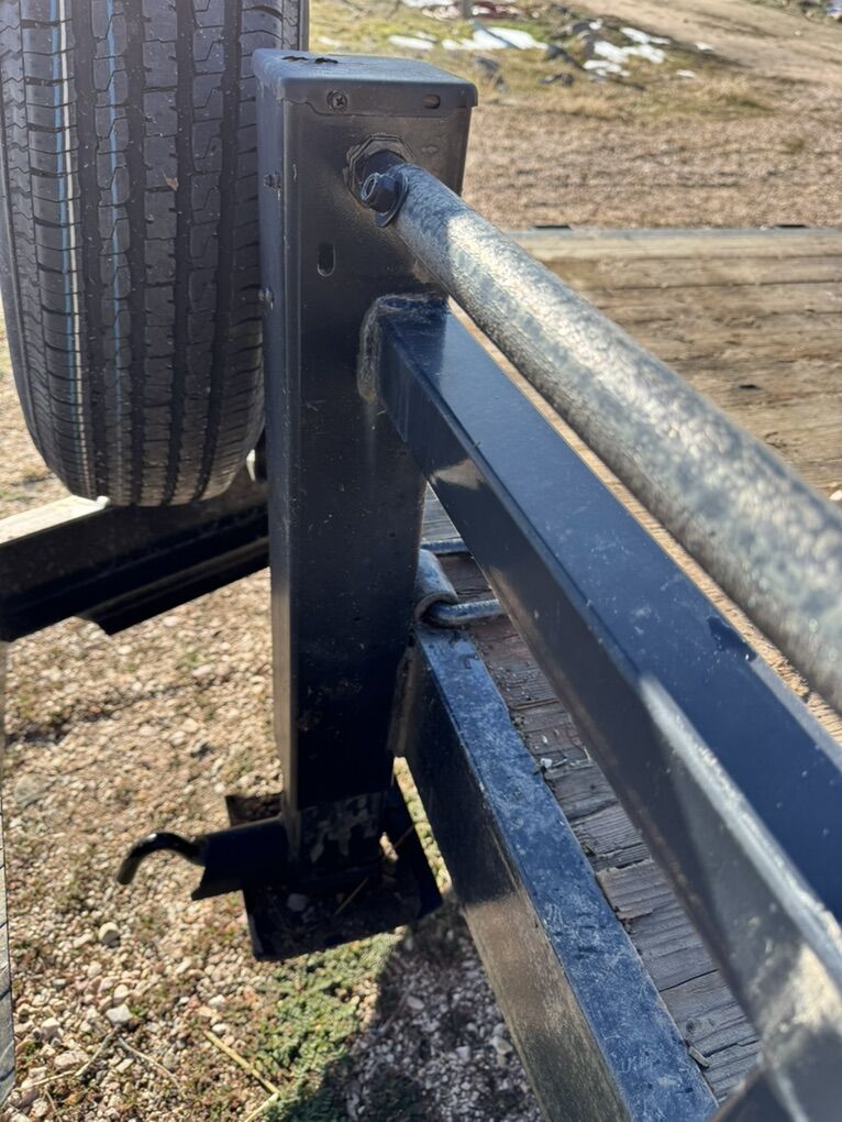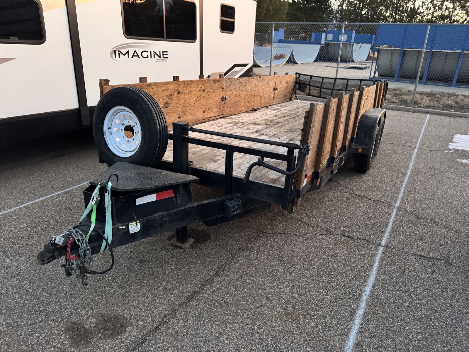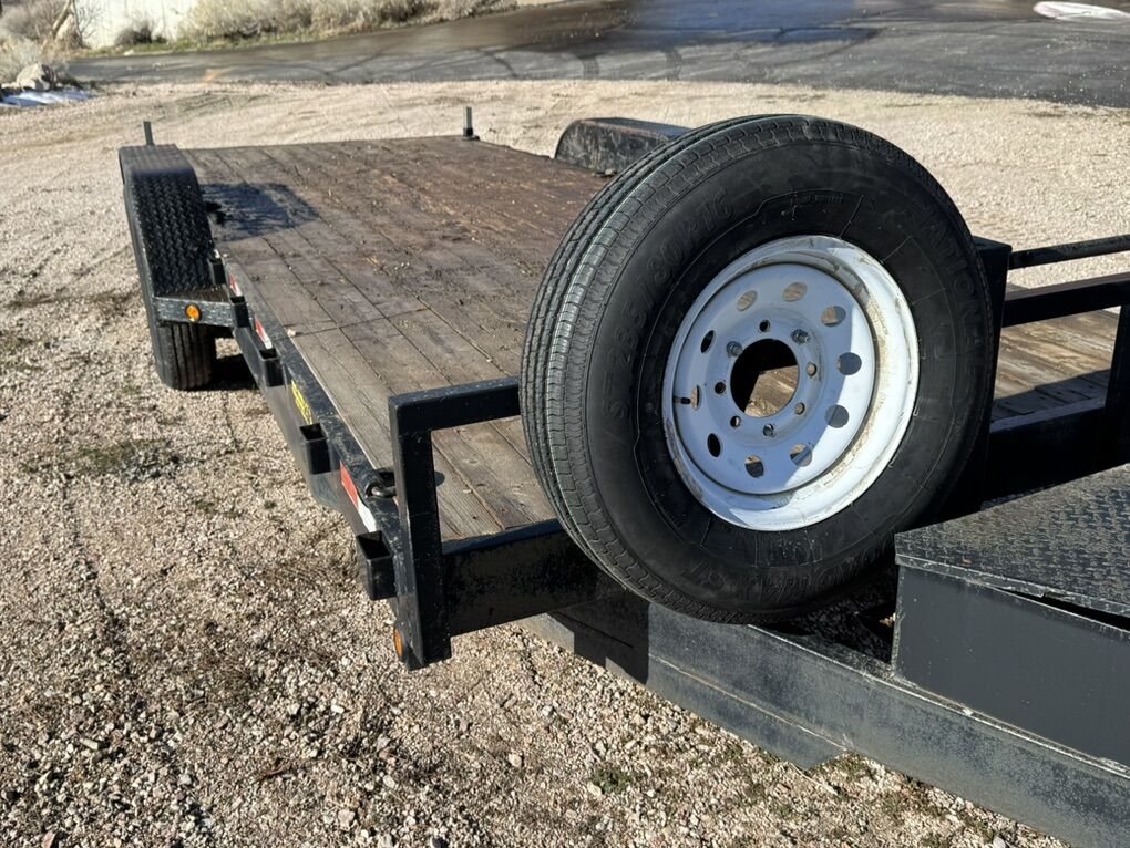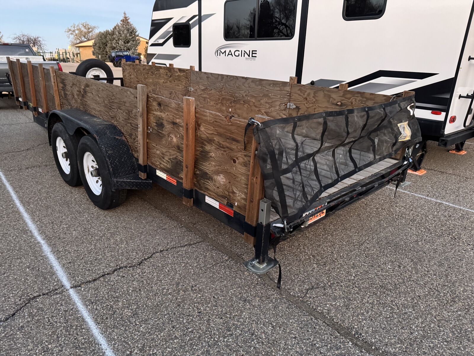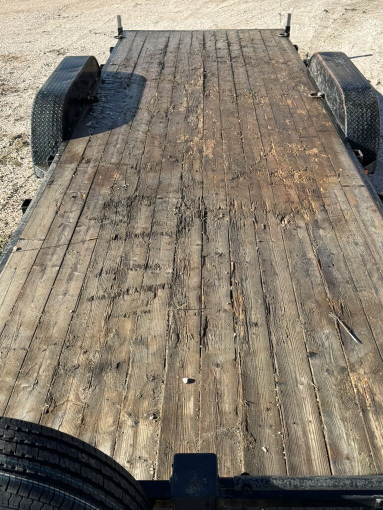 VenmoGood condition. Low miles. New spare. Electric brakes. Has pressure treated lumber stake sides and poly mesh tailgate. Ladder type ramps internally stored. Integrated landing pads. Tool box has some damage but overall great trailer. Deck is 20ft long and 82 inches between wheel wells. Title in hand.