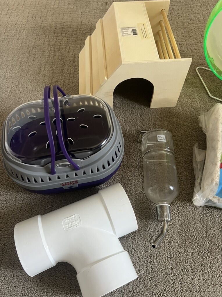 Exercise wheel Wooden hide/house Resin stump hide Small animal carrier Corner water, food, or litter tray PVC tunnel Hanging water bottle Kaytee Clean & Cozy bedding