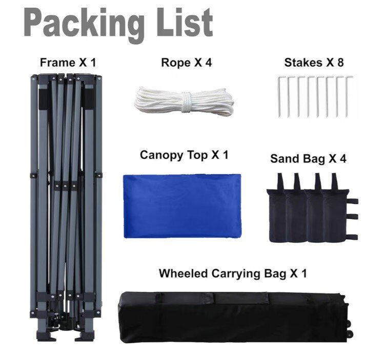 Great Value: Package includes: a Canopy with Adjustable Dual Half Awnings, 4 Sandbags, 4 Ropes, 8 Stakes for stabilizing the canopy better, and a Wheeled Bag of PVC fabric for easy transportation of the canopy. Worth purchasing.