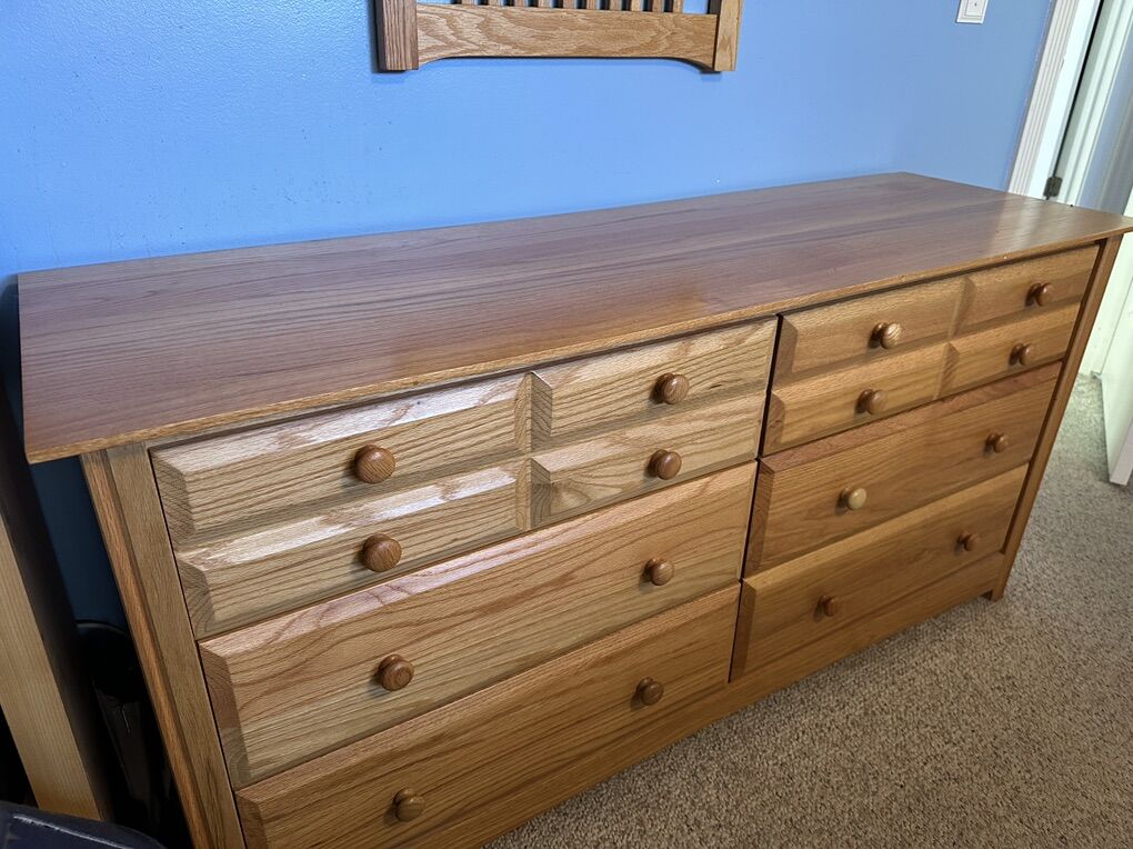 Great condition (like new) 1- Headboard 48” tall, 68.5” wide, 4” deep 1- Mirror 23” wide, 38” tall 2- side tables (2 drawers) . Each: 21.5” tall, 22.5” wide, 18.5” deep 1- dresser (6 drawers) 29” tall, 59” long, 18.5” deep