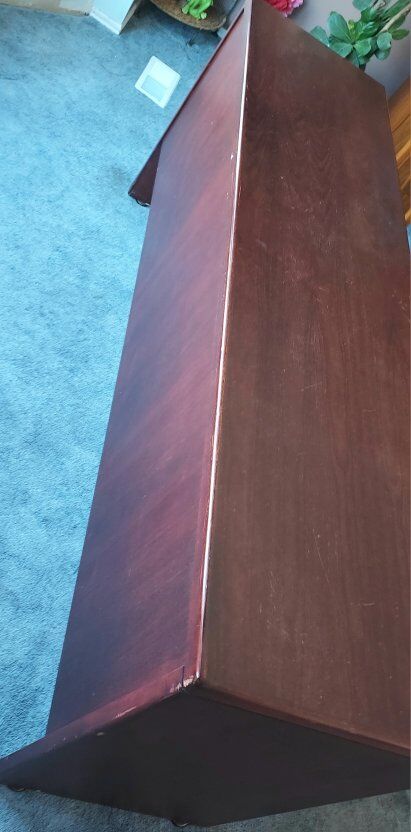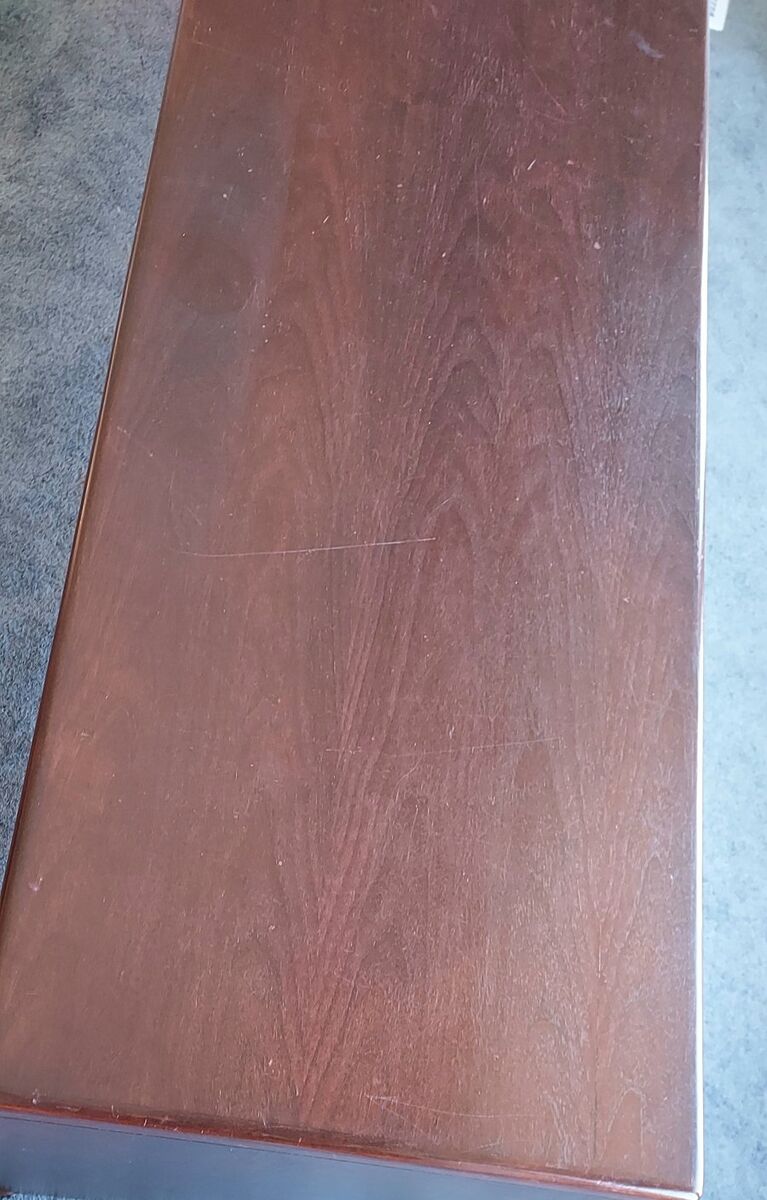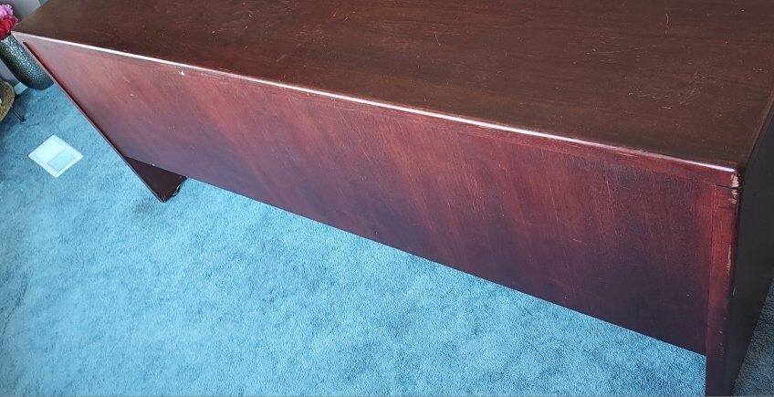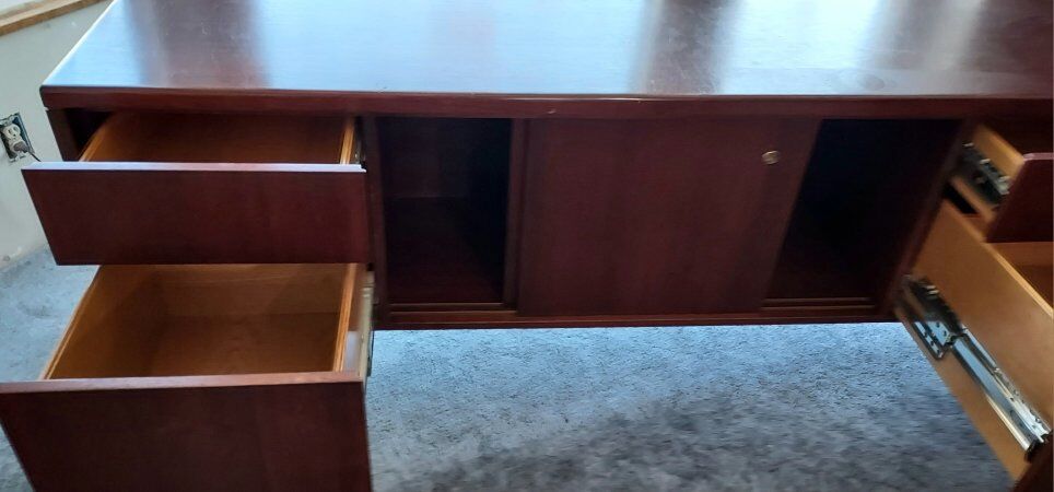 Beautiful hardwood 6' long side desk/credenza with a cherry wood finish. Not sure what type of wood it is, but it is well built and very solid, probably weighs close to 300 pounds. In good overall condition, but does have some Knicks and scratches, could use some refurbishing or refinishing. The drawers are well built... See More