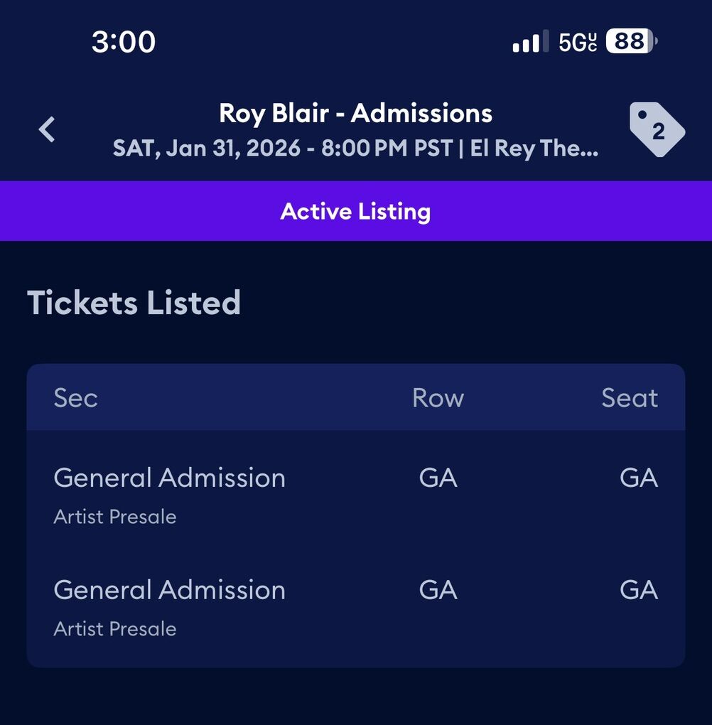 Selling two tickets for the Roy Blair concert in El Rey theater located in Las Angeles, California. My fiancée are unable to attended. Tickets will be sent through AXS for January 31, 2026. Tickets can be sold individually or together. Please feel free to contact me with any questions.