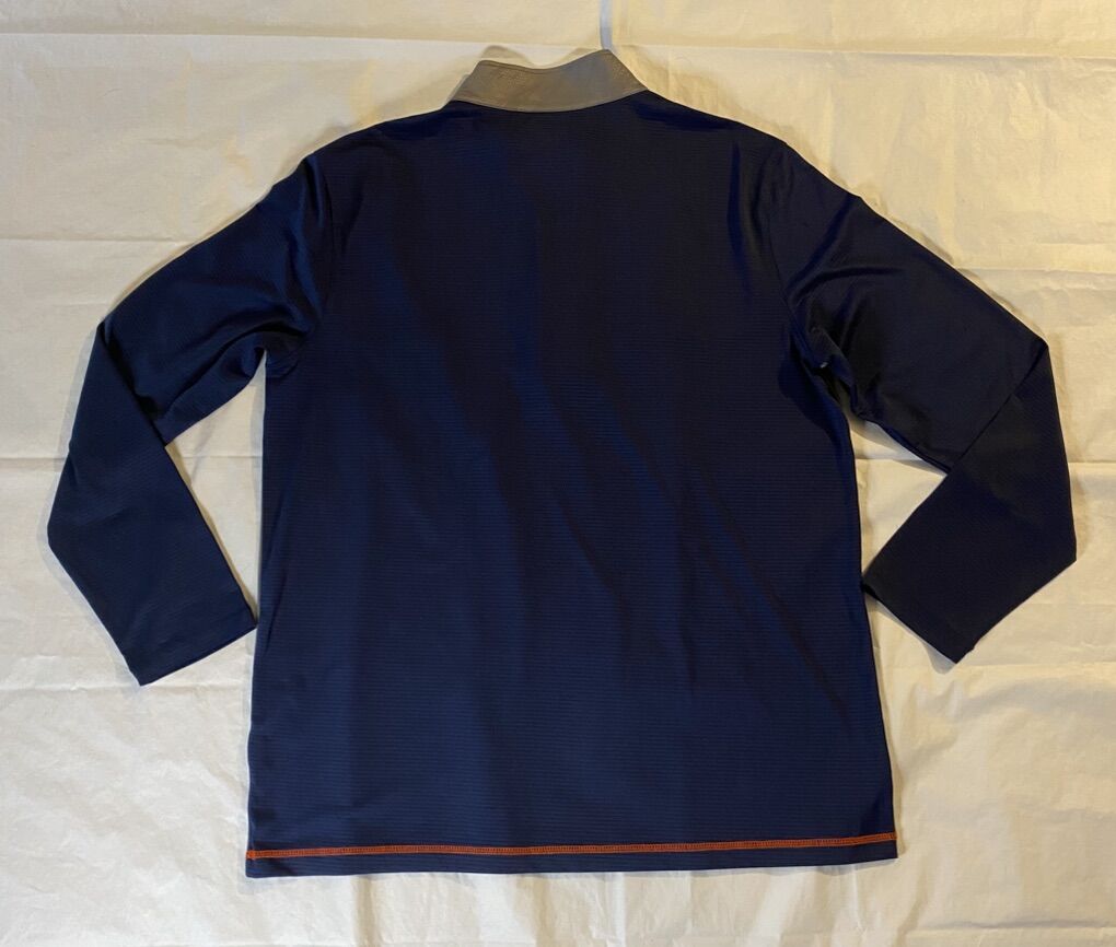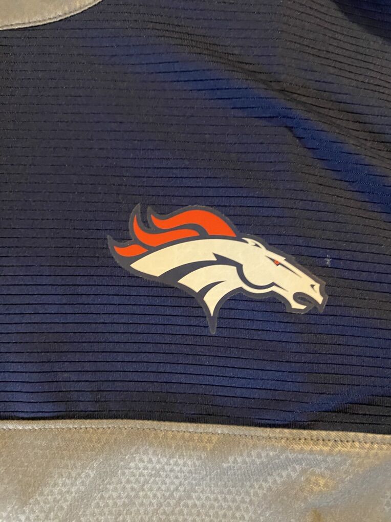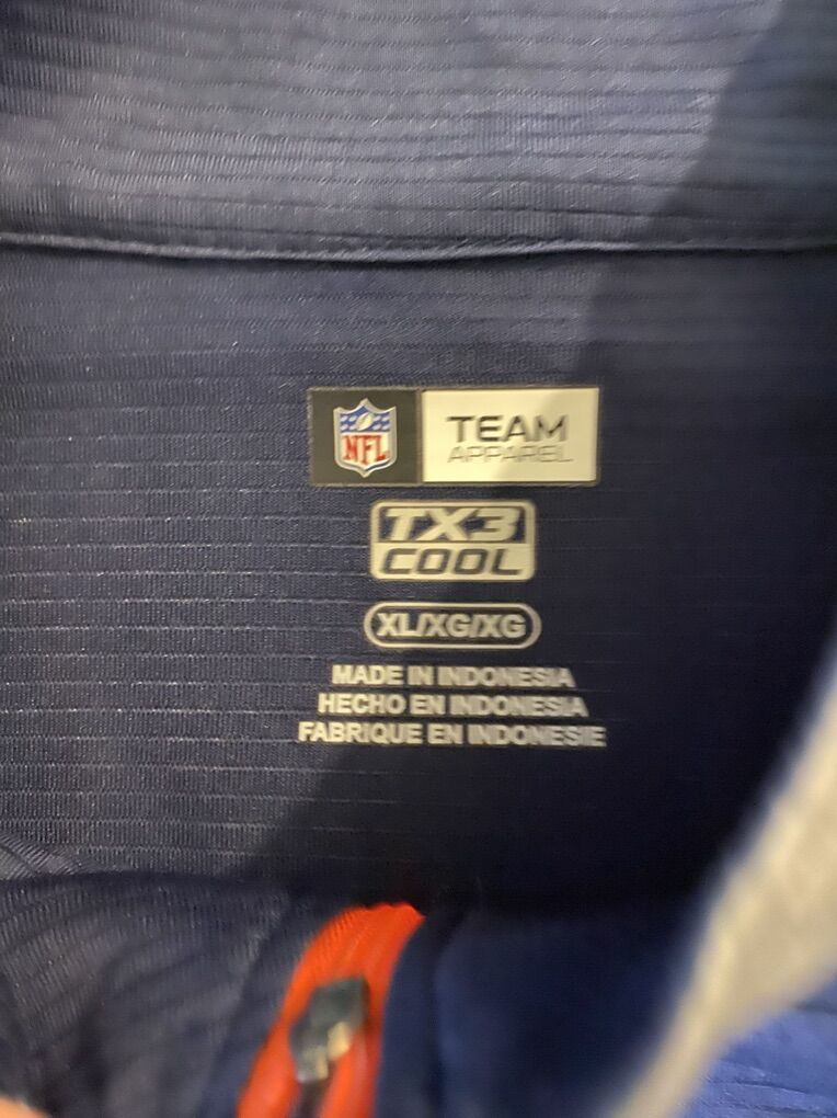 ApplePayThe product is a Men's X-Large grey and blue NFL Team Apparel 1/4 zip long sleeve pullover featuring the Denver Broncos logo. It is officially licensed by the National Football League (NFL) and made by NFL Team Apparel. Made in Indonesia, this pullover is perfect for showing support for the Denver Broncos during the regular football season. The versatile design allows for easy on and off, making it ideal for game days or casual wear.