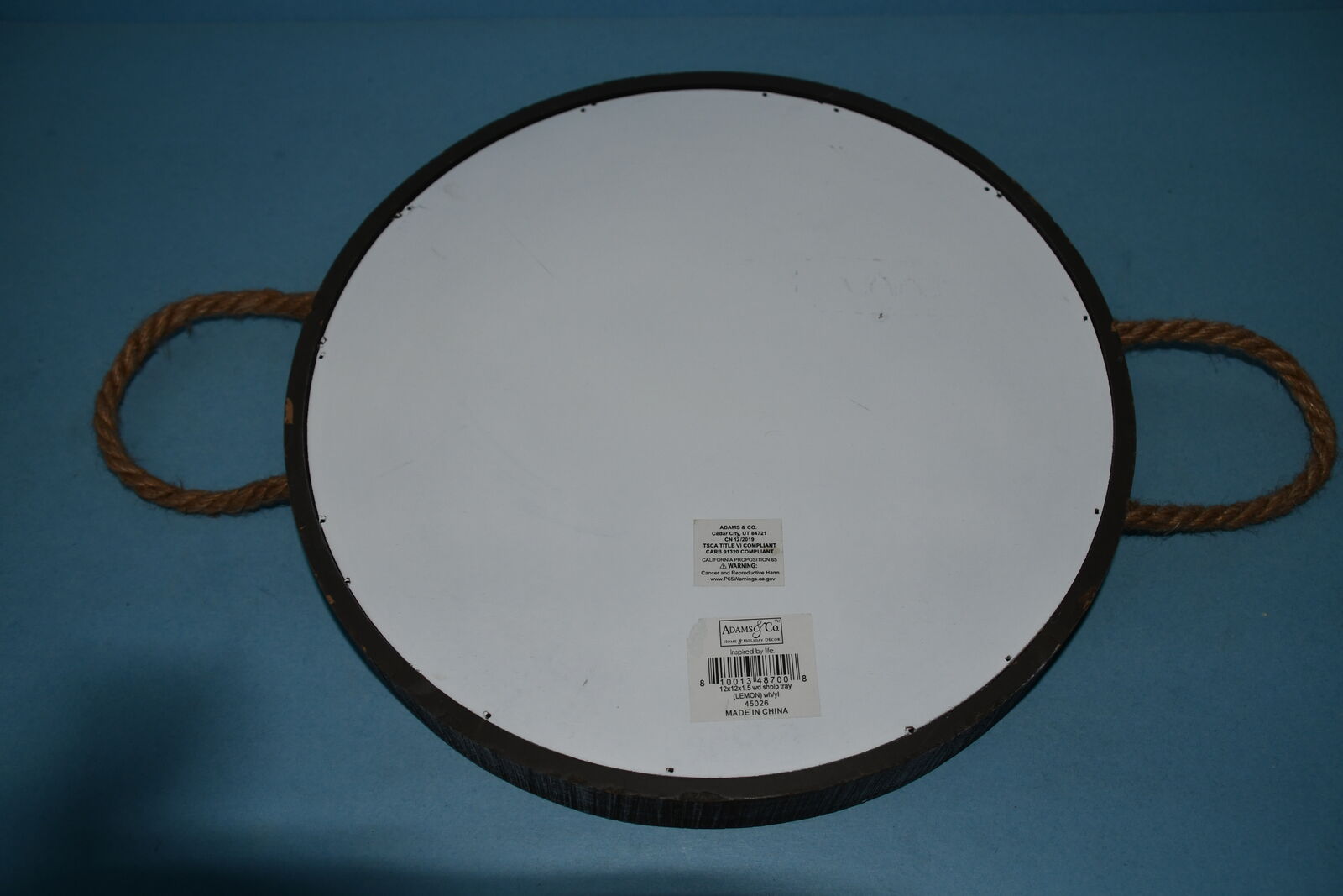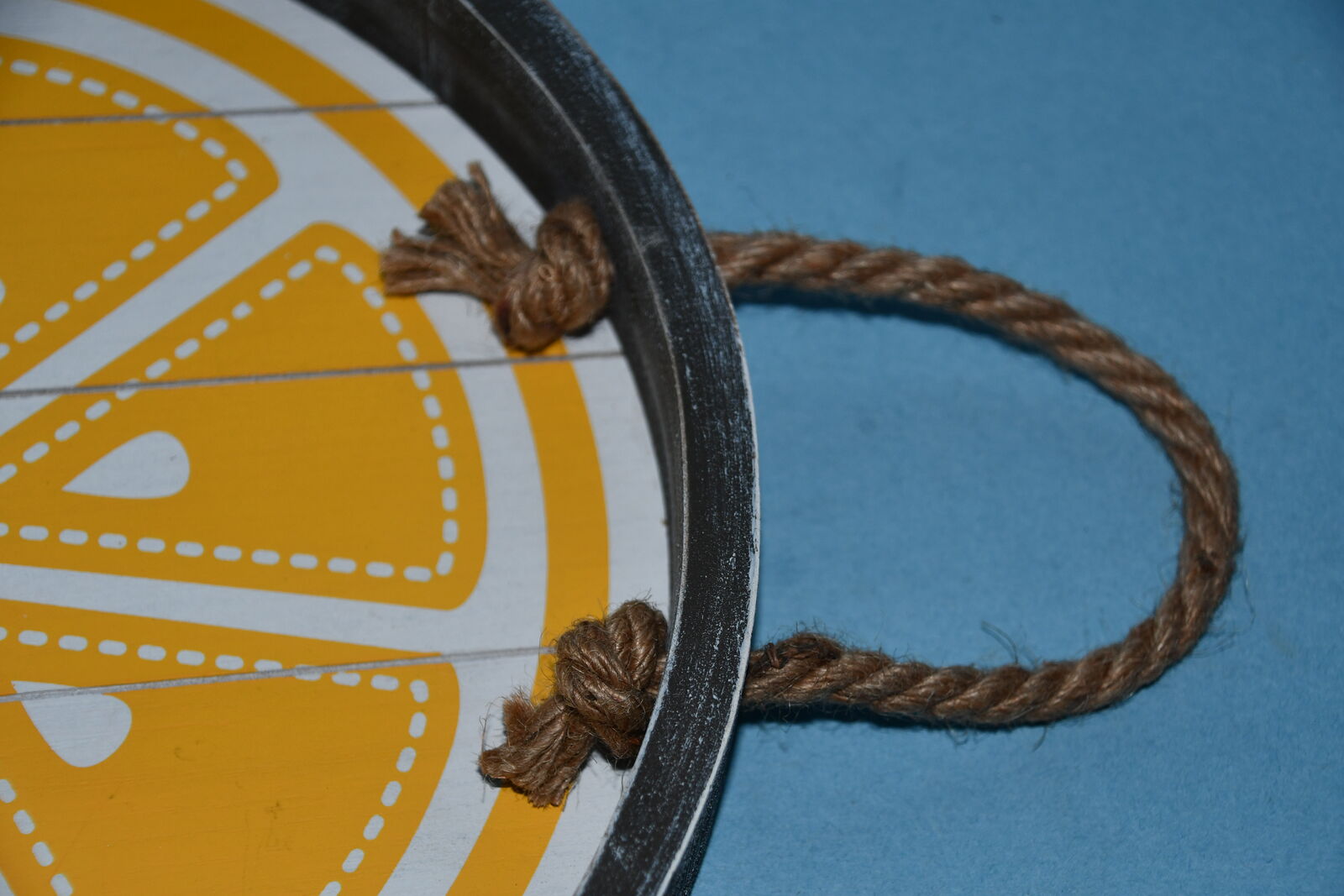 This CUTE WOODEN "LEMON TRAY" with ROPE HANDLES has a 12" diameter. It is CLEAN! Our home is smoke free. Questions??? Please ask. We are located in Plain City. Cash only please.