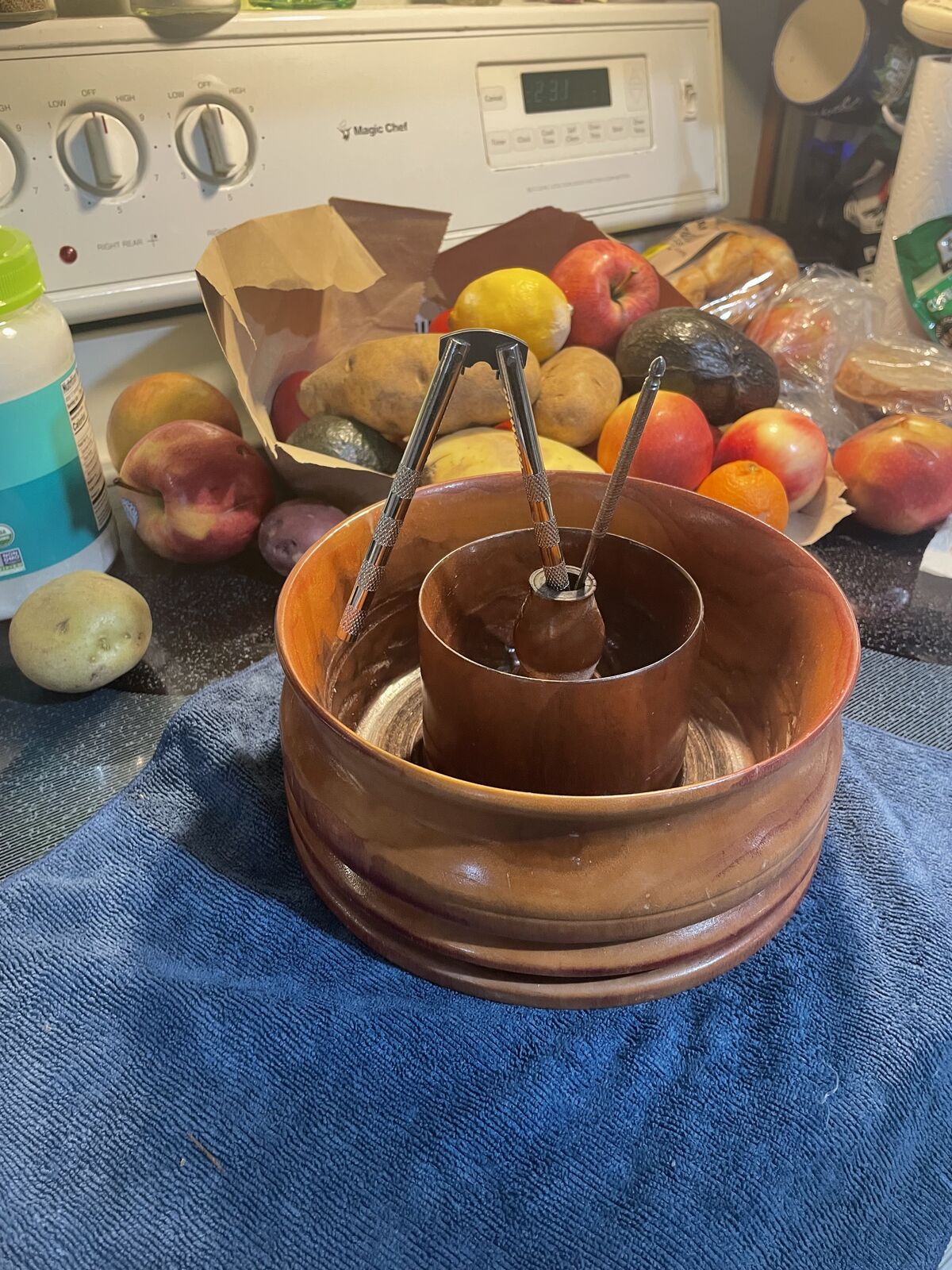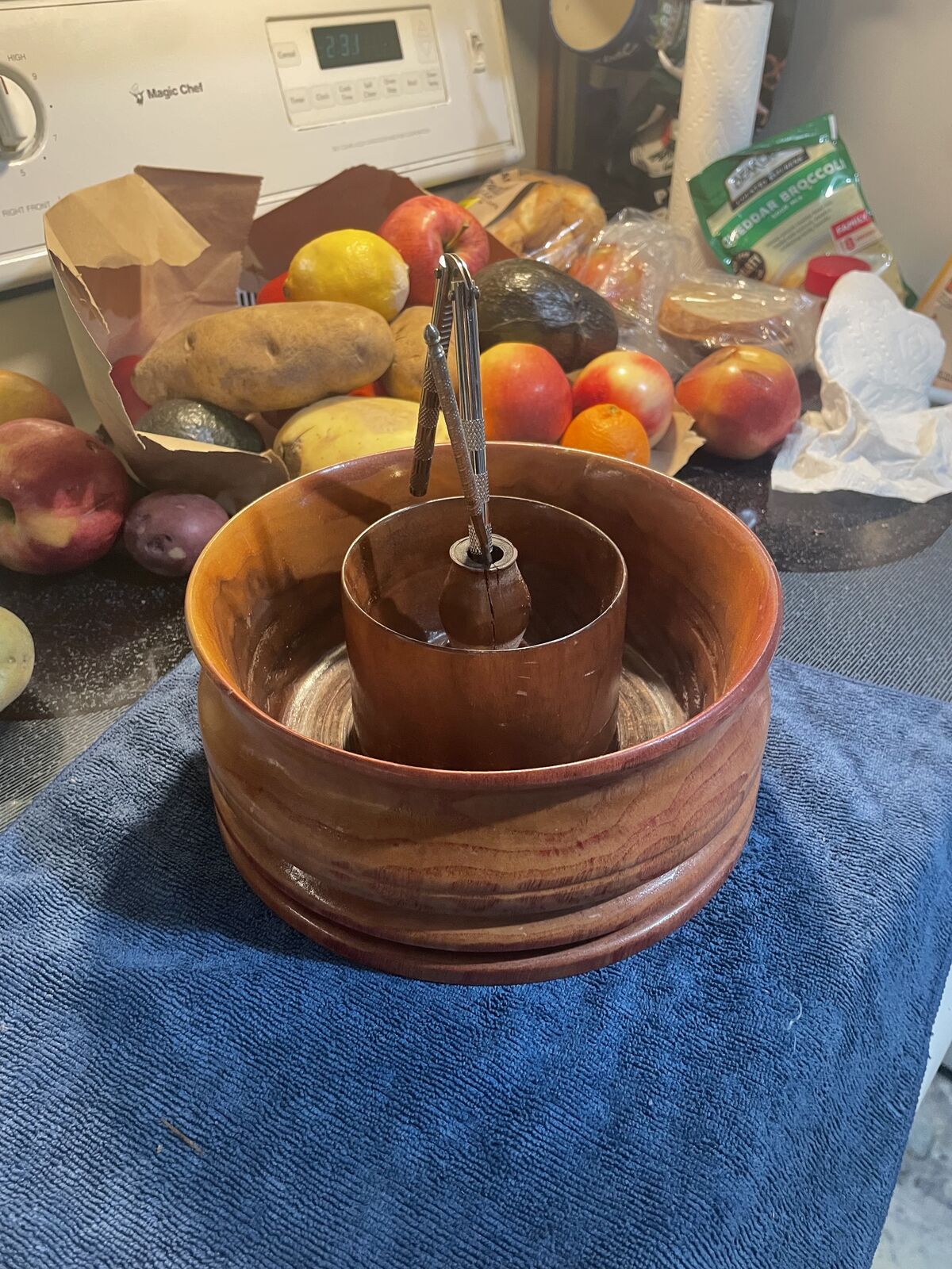 This impressive bowl is much better than others seen in shops, the same price. I planted the tree with my father around 1975. The stump remained for a year to become this for my fathers birthday May 2012, by me. It is sealed in durable Enamel to be cherished as he once did. It has a large outer ring to hold the nuts and an inner section to keep the shels. The new pick and cracker are included.