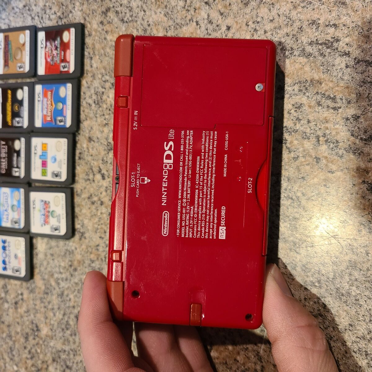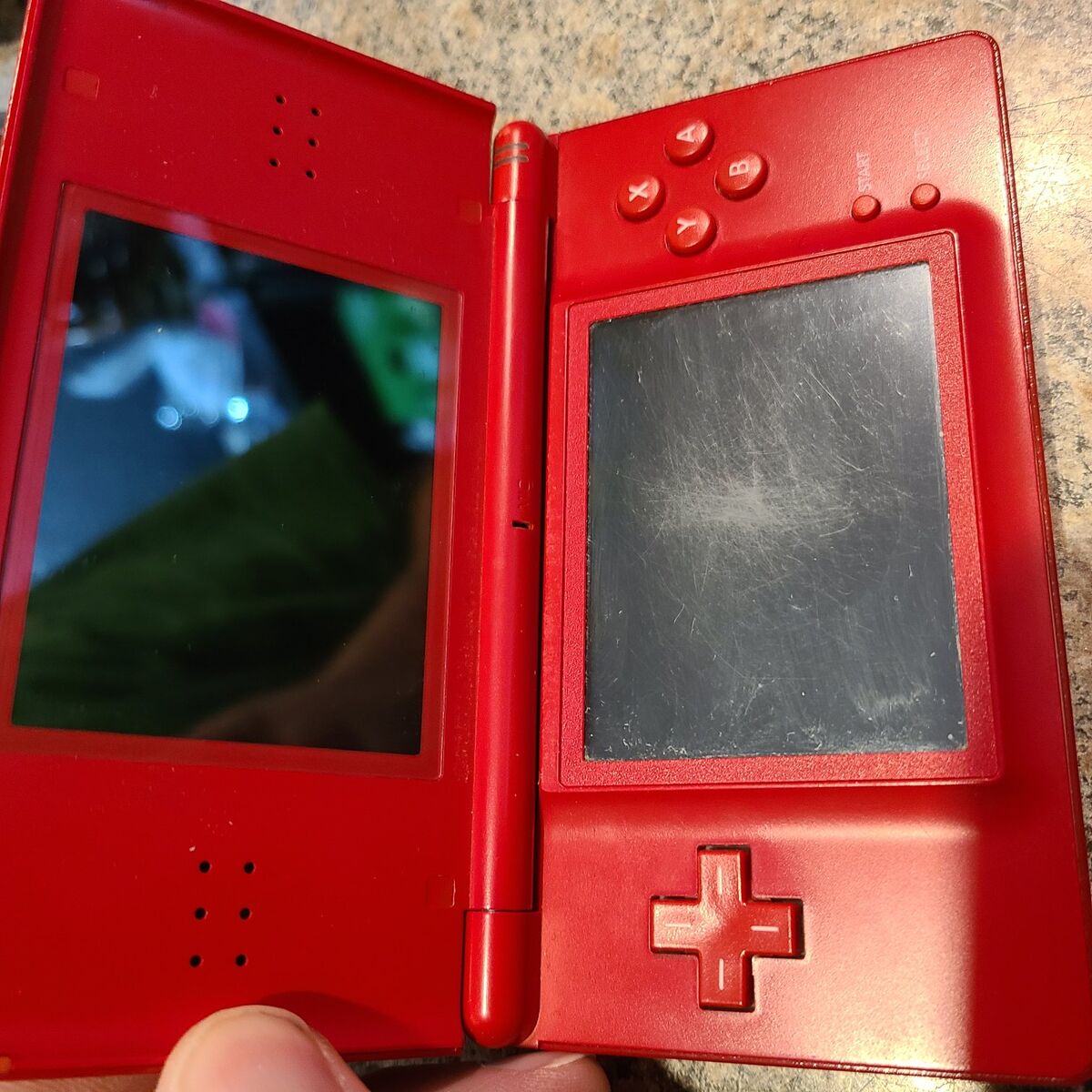 Please watch the video the front of the console has sticky residue on the m the power cable is brand new never opened comes with this awesome 3DS bag that works great. And a handful of games. Unfortunately the hinge is broken but the console still works great. Screen is scratched. Located in Roy Utah might be willing to trade for Nintendo Wii games or drums and guitars for Guitar Hero or rock band. Shipping is available price depends on your location please message me please look at my other video games and my other listings