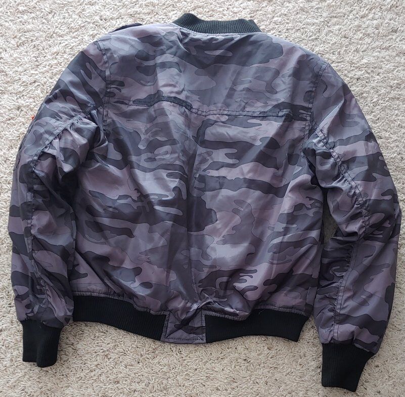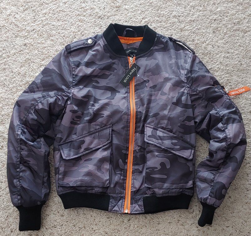 ZelleNew Look brand bomber style jacket in a gray camouflage print. Has rushing on arms for a feminine look. Size small for petite woman or juniors.
